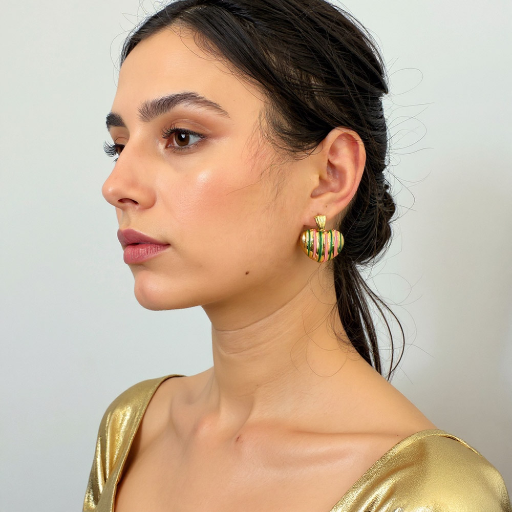 Details • Size : 1.2" X 1.4" • Post Back • Make a playful yet bold statement with these striped enamel heart earrings, designed with a textured finish and vibrant detail. Perfect for adding a pop of personality, these earrings bring a fun, fashion-forward touch to everyday outfits and standout evening looks. • Brass • Gold Dipped • Hypoallergenic • Lead and Nickel Compliant • Made In Korea