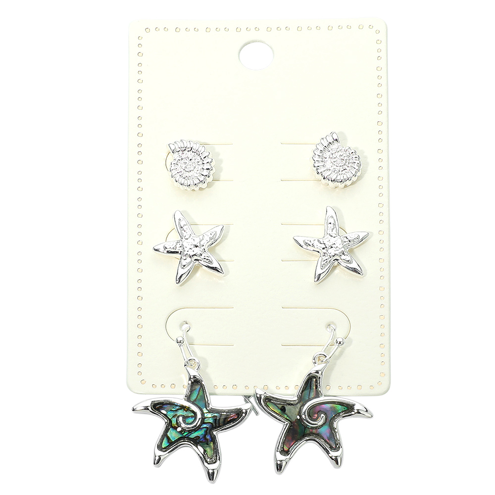 Details • Size : 0.4" - 1.3" L • Post Back, Fish Hook Back • Three-pair starfish-themed earring set featuring textured stud designs, dimensional star accents, and dangling starfish styles. Perfect for mix-and-match wear, coastal looks, vacations, and everyday styling. A versatile accessory set ideal for gift displays, seasonal collections, and trend-focused jewelry assortments. • Lead and Nickel Compliant