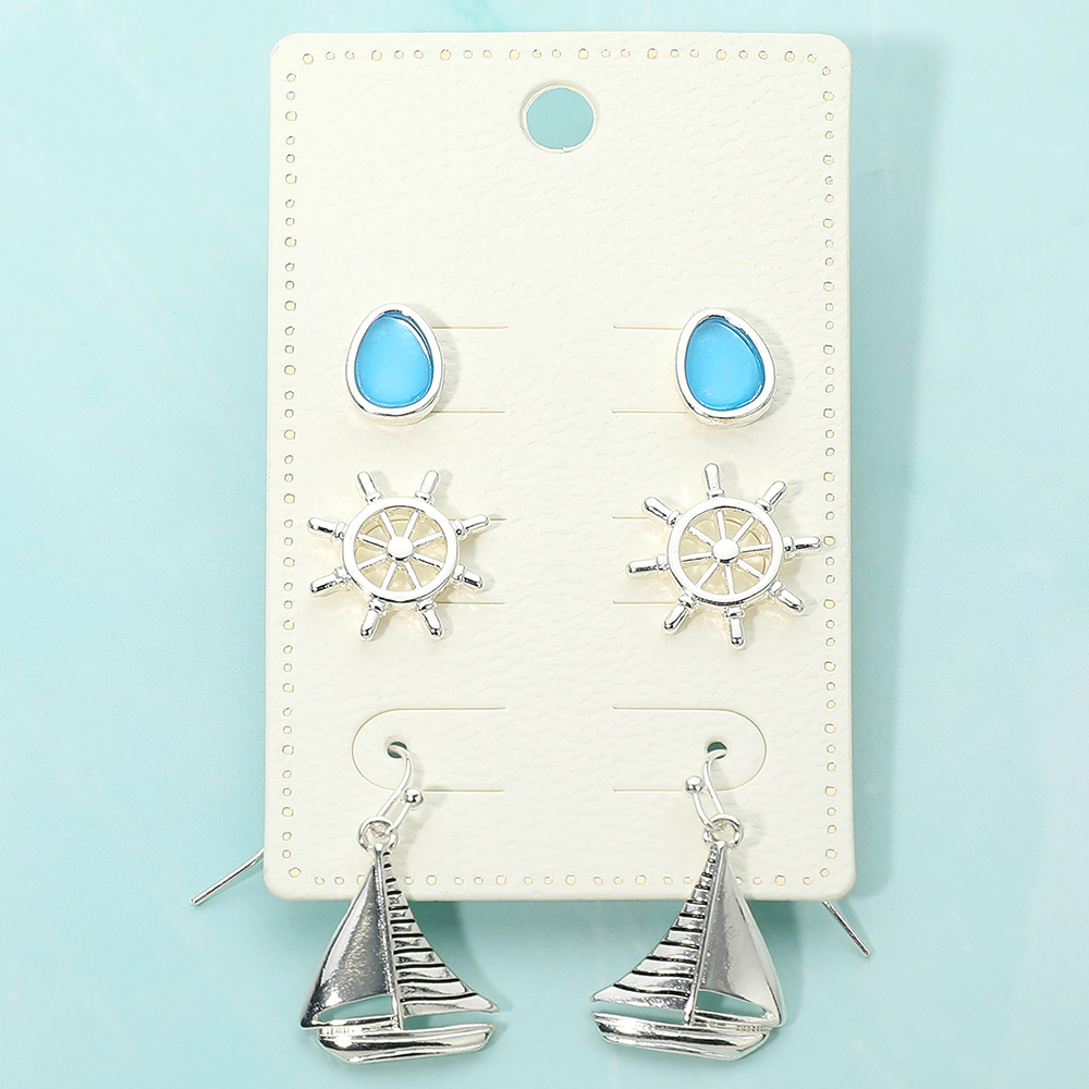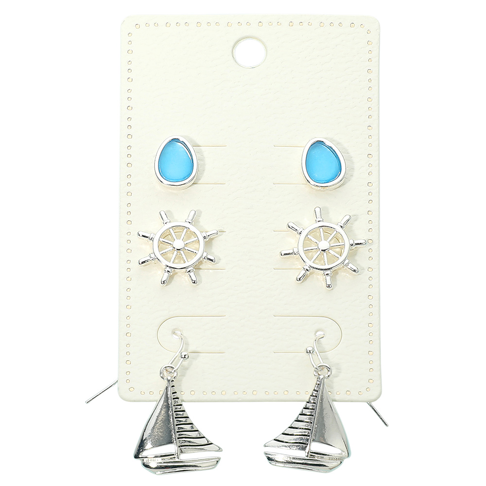 Details • Size : 0.4" - 1.25" L • Post Back, Fish Hook Back • Ocean-inspired three-pair earring set featuring smooth stud accents, classic nautical wheel motifs, and dangling sailboat designs. This versatile assortment offers mix-and-match styling for everyday wear, coastal themes, travel looks, or seasonal collections, adding playful charm and variety to any accessory selection. • Lead and Nickel Compliant