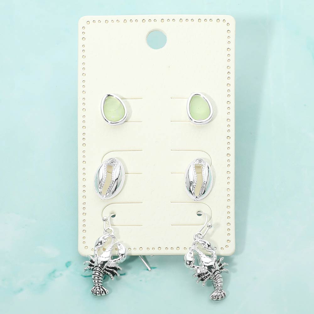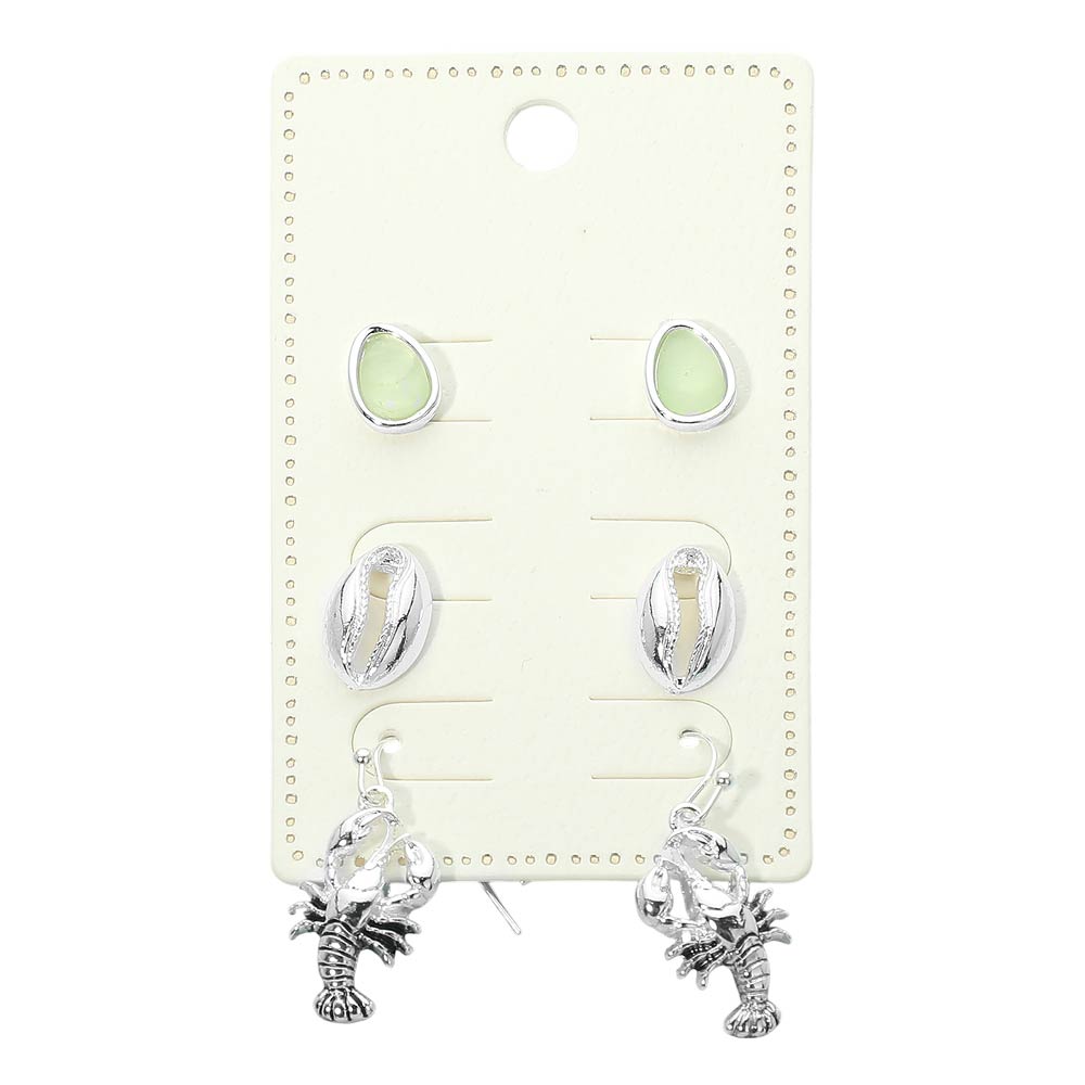 Details • Size : 0.4" - 1.24" L • Post Back / Fish Hook Back • This stud earring set features three coordinating designs, including smooth teardrop studs, shell-inspired studs, and playful lobster charm drop earrings. Created for easy mix-and-match styling, this versatile set brings a fun coastal theme to everyday outfits and is ideal for resort shops, seasonal displays, and gift-ready accessory collections. • Lead and Nickel Compliant