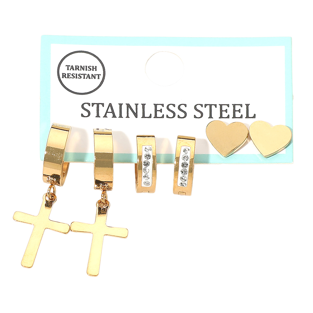 Details • Size : 0.3" - 1.25" L • Huggie Back, Post Back • A versatile stud and mini dangle earring set featuring cross accents, sleek bar styles with crystal detail, and classic heart shapes. Designed for easy mixing and matching, this set offers everyday styling flexibility, layered ear looks, and modern appeal for boutique jewelry collections and gift-ready displays. • Stainless Steel