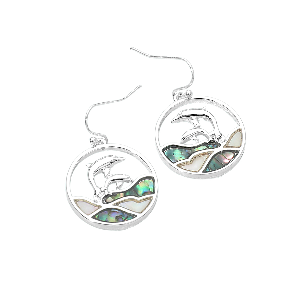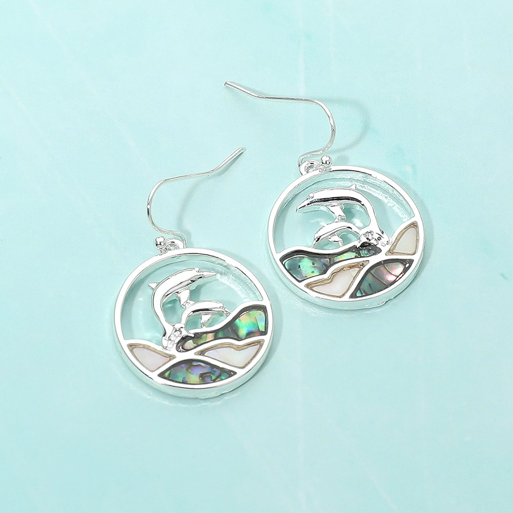 Details • Size : 0.8" X 1.3" • Fish Hook Back • Playful round dangle earrings showcasing a graceful dolphin leaping over flowing wave details. Designed to move with every step, they bring a relaxed coastal feel to everyday outfits, vacation looks, and resort styling. Ideal for beach boutiques, ocean-inspired collections, and gift-ready accessory displays. • Lead and Nickel Compliant