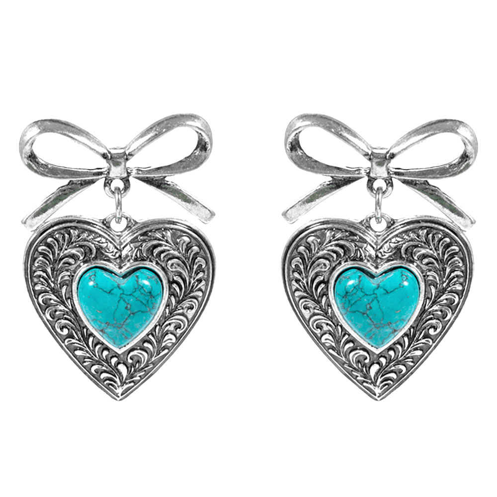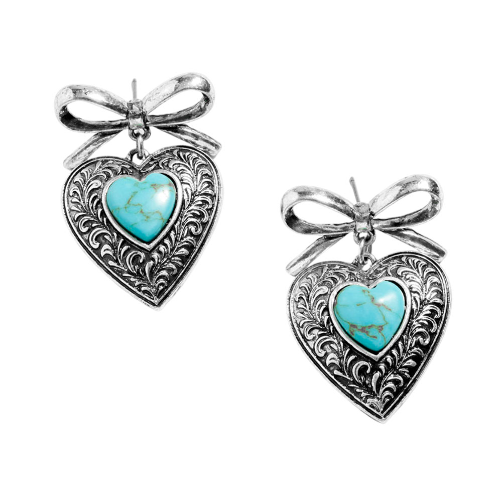 Details • Size : 1.25" X 2.8" • Titanium Post Back • Charming heart-shaped dangle earrings topped with a delicate bow design and detailed texture, created for playful everyday wear or special occasions, adding romantic flair to casual outfits, date nights, gifts, or statement accessory collections with timeless appeal. • Lead and Nickel Compliant
