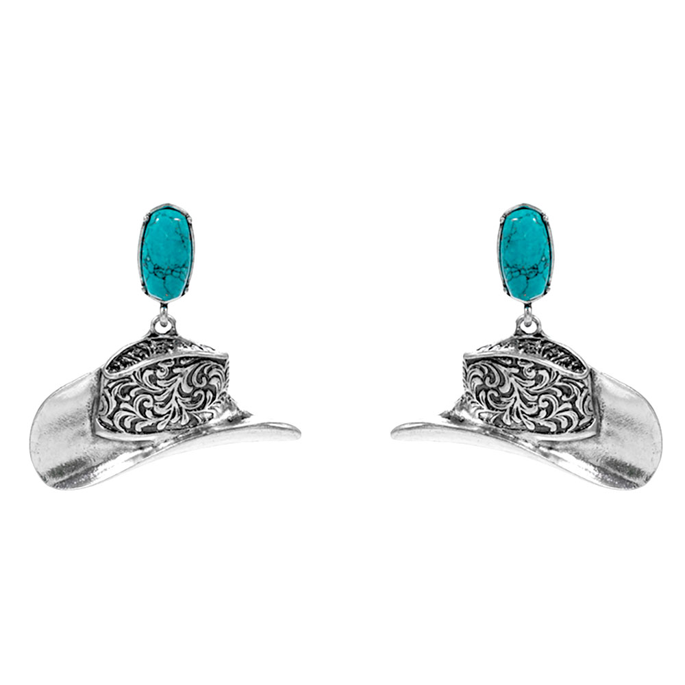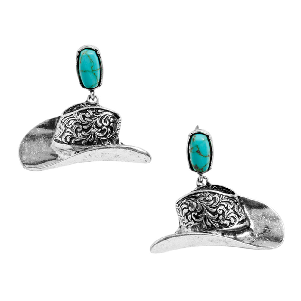Details • Size : 1.7" X 1.6" • Titanium Post Back • Vintage-inspired western hat dangle earrings with detailed engraving and bold silhouette that bring playful charm to everyday outfits and special looks, ideal for festivals, casual styling, themed events, or as a standout gift for lovers of unique statement accessories. • Lead and Nickel Compliant