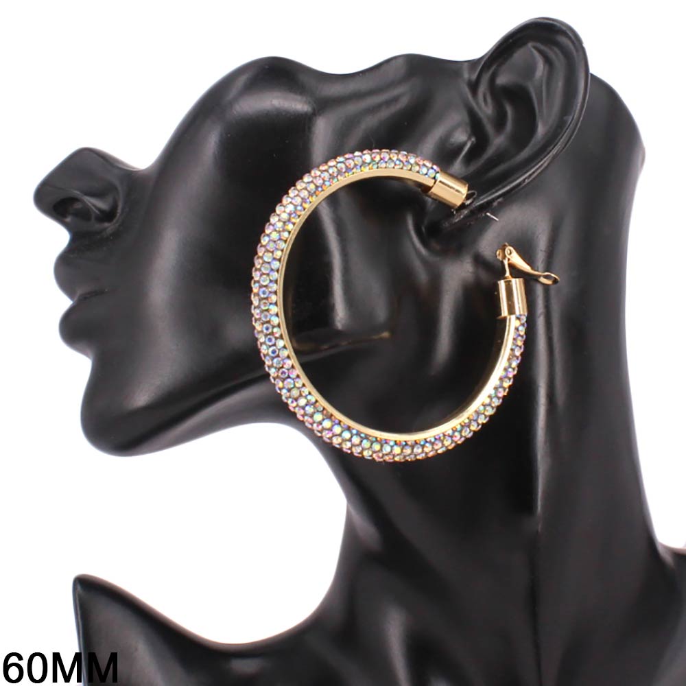 • Statement hoop earrings designed with a sleek curved silhouette and fully embellished surface for maximum shine. The bold 60mm size creates instant impact while remaining lightweight and comfortable for extended wear. Ideal for parties, festivals, night events, and trend-forward jewelry collections.