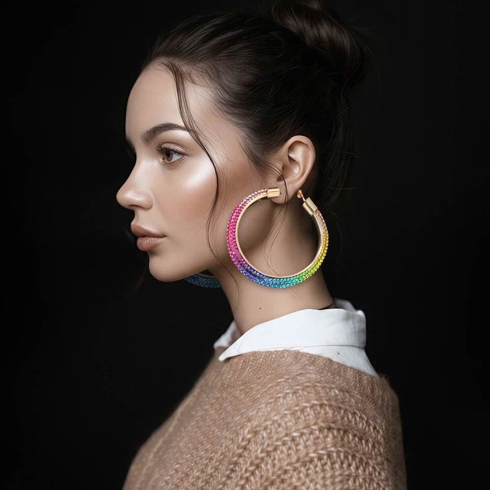 • Statement hoop earrings designed with a sleek curved silhouette and fully embellished surface for maximum shine. The bold 60mm size creates instant impact while remaining lightweight and comfortable for extended wear. Ideal for parties, festivals, night events, and trend-forward jewelry collections.