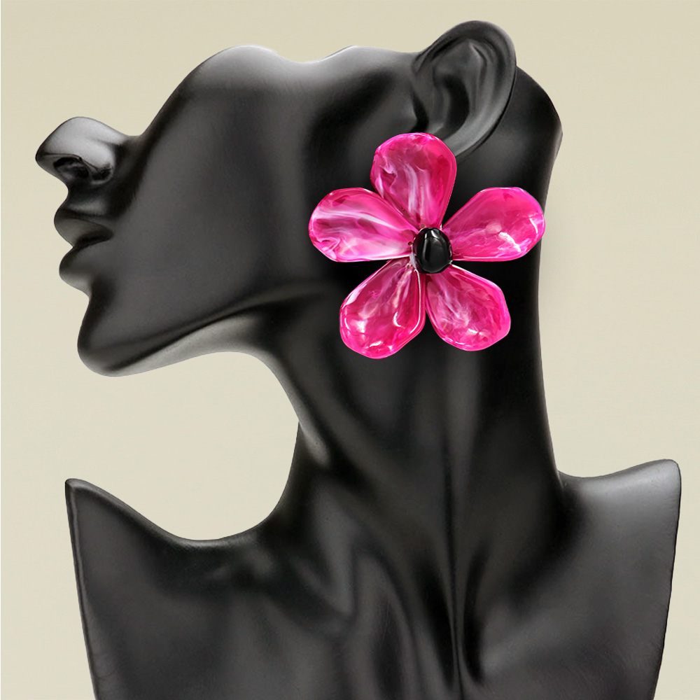 Details • Size : 2.5" X 2.5" • Post Back • Bold statement earrings featuring large petal-shaped floral design with glossy finish. Perfect for elevating any outfit, these eye-catching earrings add a touch of artistic flair and elegance, ideal for special occasions, photoshoots, or standout fashion looks. • Lead and Nickel Compliant