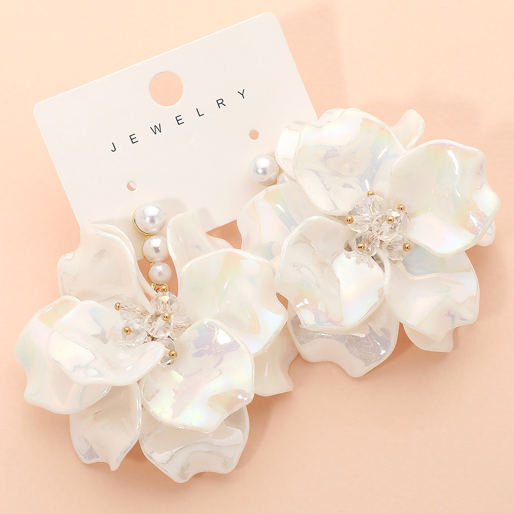 Bold Layered Petal Floral Pearl Drop Statement Earrings