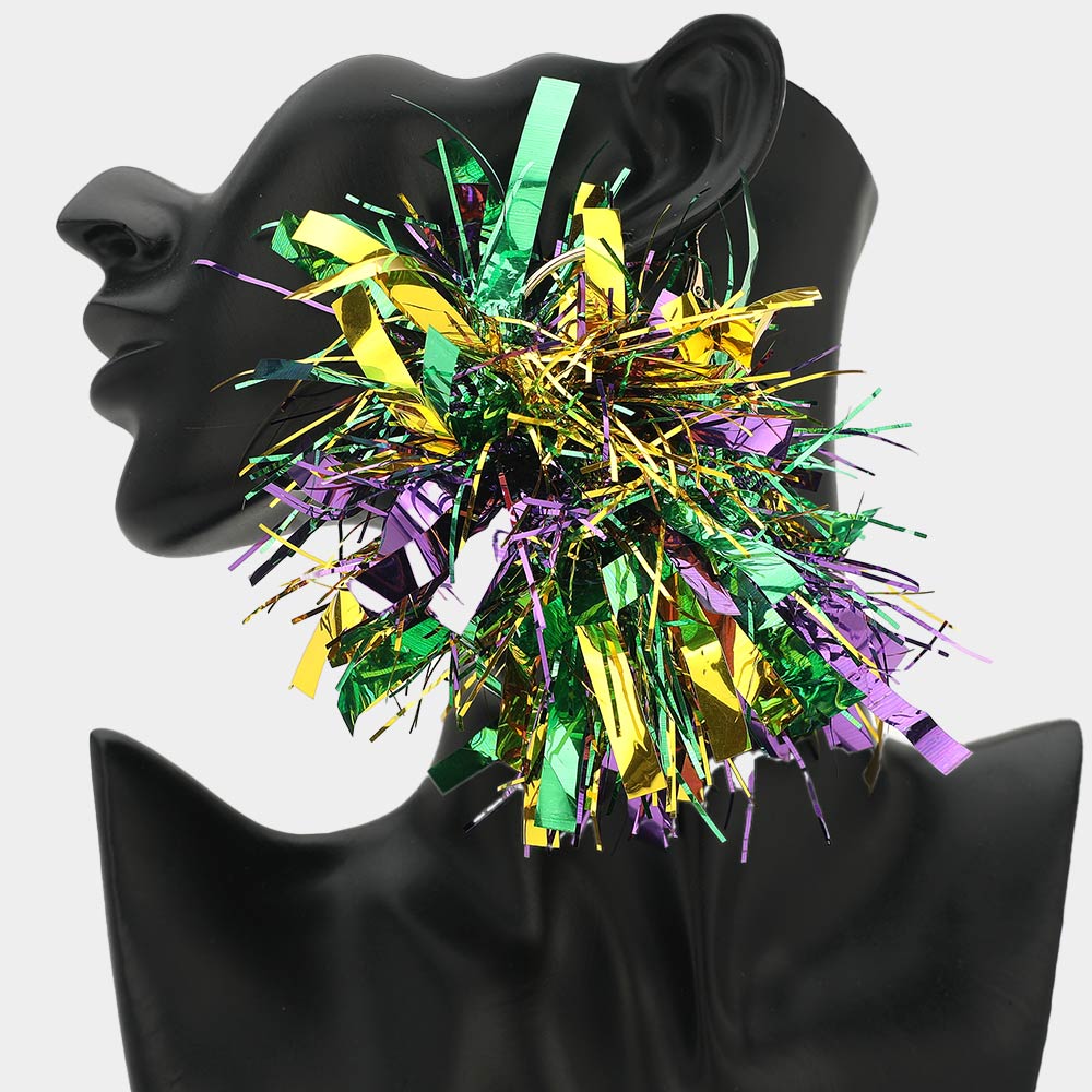 Details • Size : 5" X 4" • Post Back • These Mardi Gras tinsel fringe statement earrings deliver bold volume and playful movement for festive looks. Designed to stand out at parades, parties, and themed events, they add instant personality to outfits and costumes. Lightweight for comfortable wear, they are ideal for seasonal styling, gift assortments, and eye-catching retail displays. • Lead and Nickel Compliant