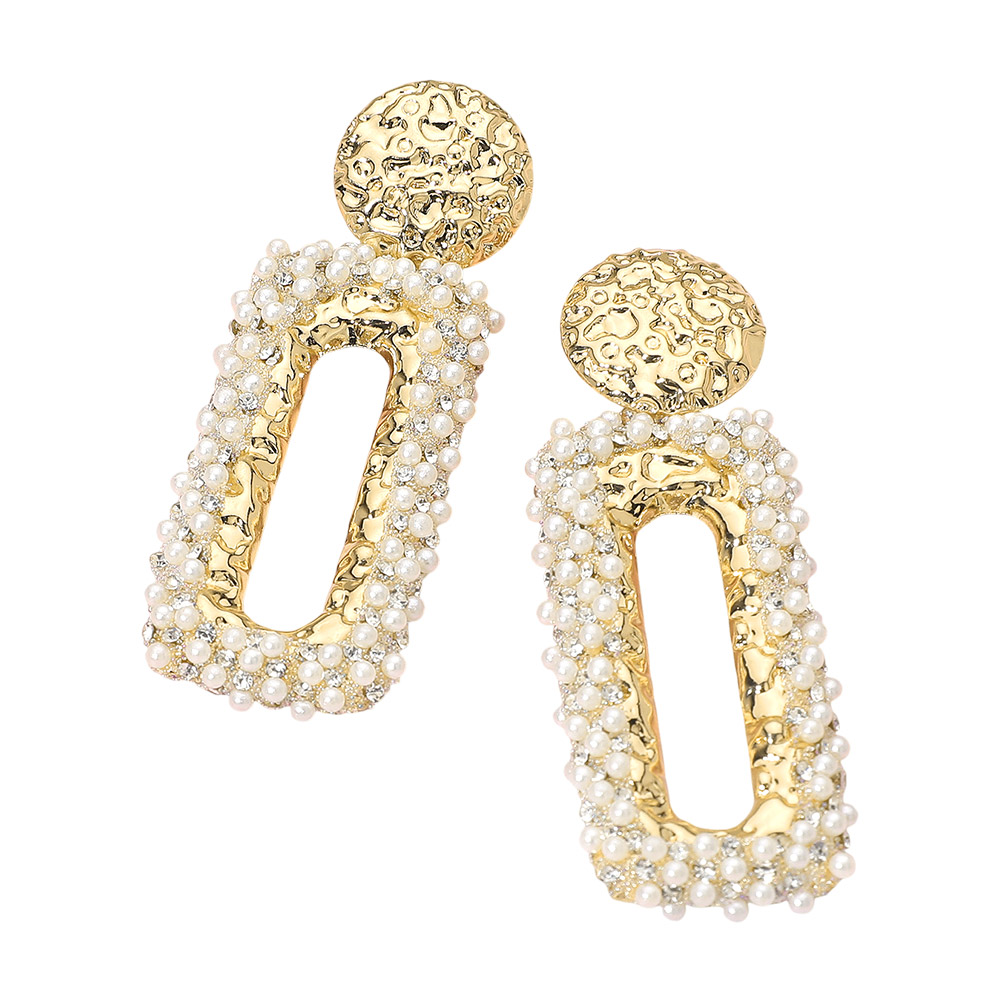 Details • Size : 1.2" X 2.75" • Post Back • These hammered metal pearl border drop earrings blend a textured metallic surface with refined bead detailing for a luxurious finish. Their elongated open shape creates a graceful silhouette, making them ideal for adding a touch of sophistication and modern glamour to any ensemble. • Lead and Nickel Compliant
