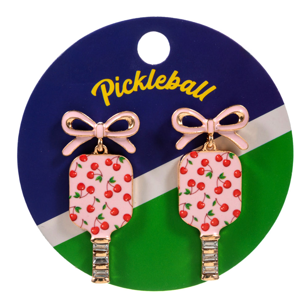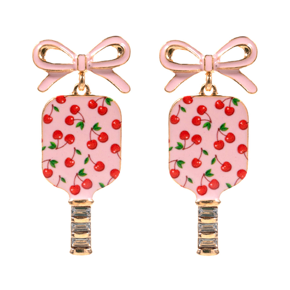 Details • Size : 0.8" X 1.75" • Post Back • These pickleball paddle drop earrings feature a charming bow accent and playful patterned design, adding a fun and sporty touch to any outfit. Perfect for everyday wear, gifting, or pickleball lovers, they bring personality and style to casual looks while remaining lightweight and easy to pair with seasonal accessories. • Lead and Nickel Compliant