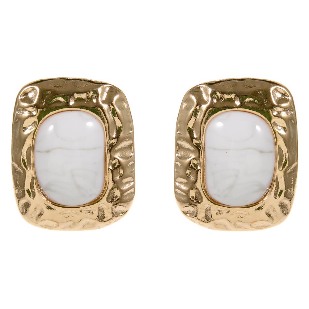 • Statement stud earrings featuring a bold framed design with a smooth stone-style center and organic textured detailing. Designed to add modern elegance to everyday looks, these studs are ideal for casual styling, office wear, or gift assortments. A versatile accessory for boutiques seeking trend-forward appeal.