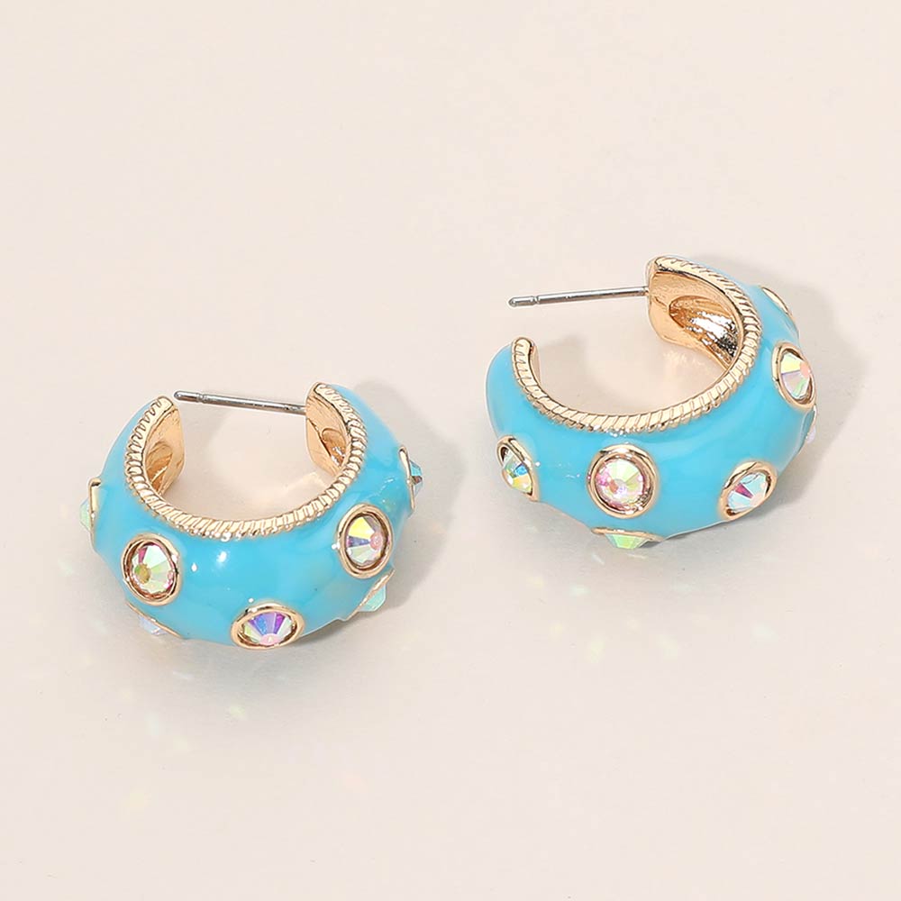 • Bold huggie hoop earrings designed with raised detailing and sparkling accent elements for a standout statement look. The compact hoop shape offers comfortable wear while adding eye catching texture and shine. Ideal for boutique collections, trend driven styling, gifting, and special occasions. A modern accessory that elevates everyday outfits with confident, fashion forward appeal.