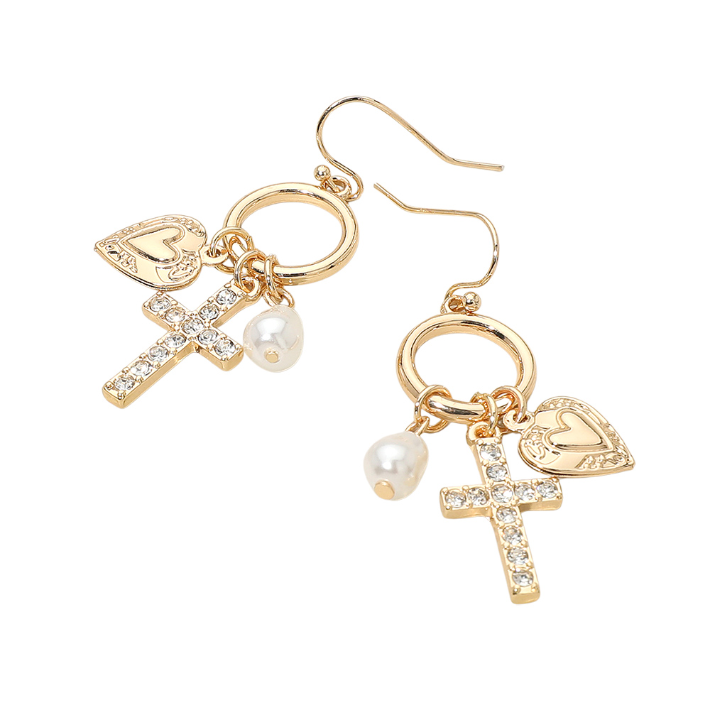 Cross Heart Pearl Charm Drop Dangle Earrings Cross Heart Pearl Charm Drop Dangle Earrings