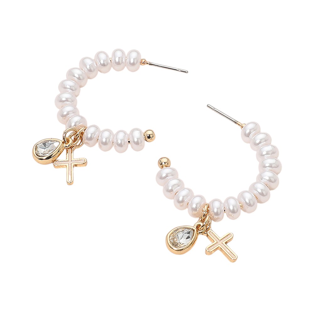• Enhance your look with these Pearl Hoop Earrings featuring delicate cross and crystal charms. Perfect for both casual and formal outfits, these stylish earrings blend elegance and sophistication, adding a refined sparkle to your jewelry collection.