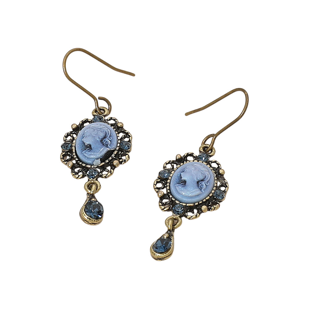 Details • Size : 0.6" X 1.6" • Fish Hook Back • Elegant vintage cameo drop earrings featuring detailed profile portraits framed with sparkling rhinestones and teardrop crystal charms. Perfect for adding a touch of timeless sophistication to both casual and formal outfits. • Made in USA • Lead and Nickel Compliant