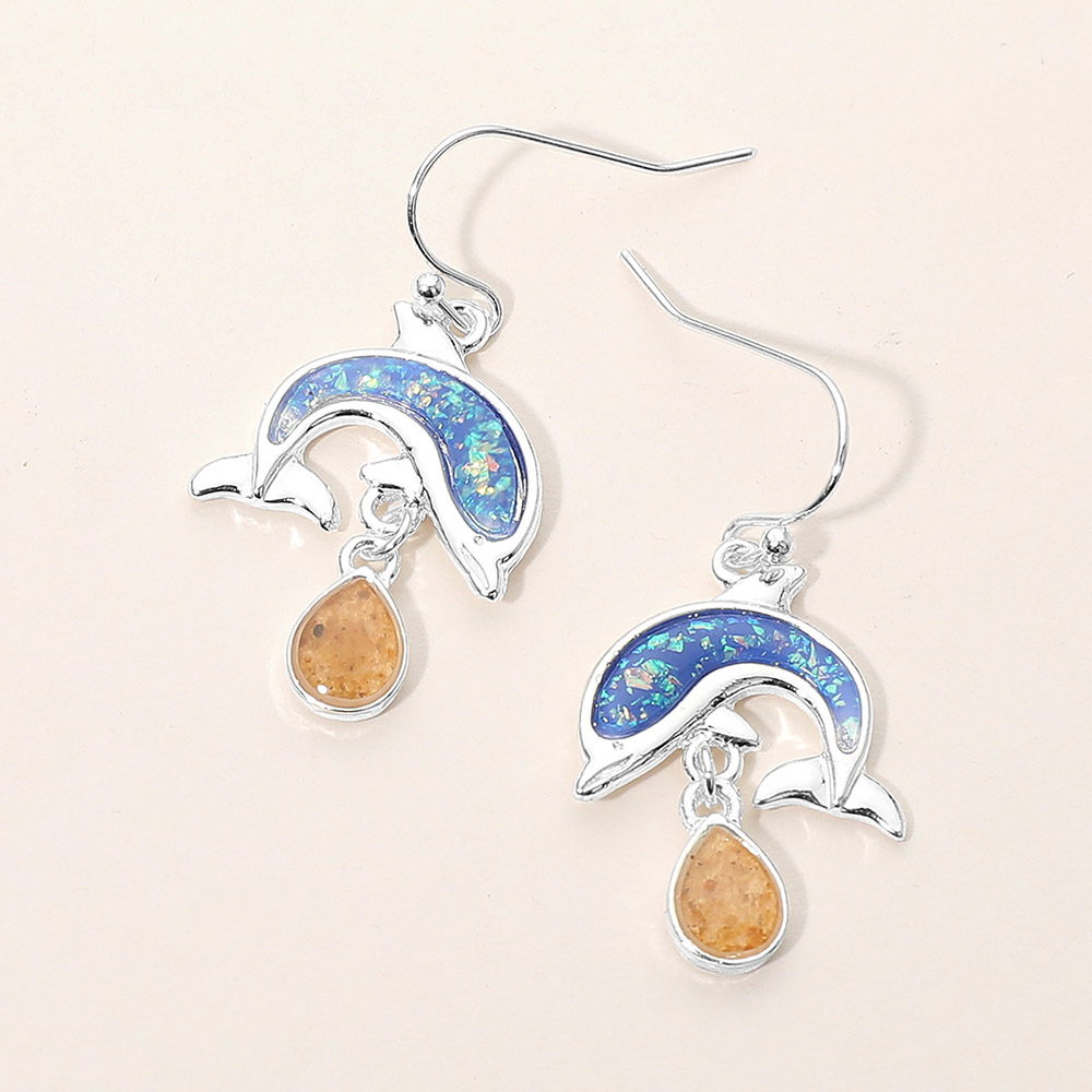 • Playful dolphin charm drop earrings featuring a graceful marine silhouette with subtle movement for eye catching appeal. A fun coastal inspired accessory ideal for summer outfits, vacation looks, and beach themed collections, adding personality and seasonal charm to boutique and gift focused assortments.