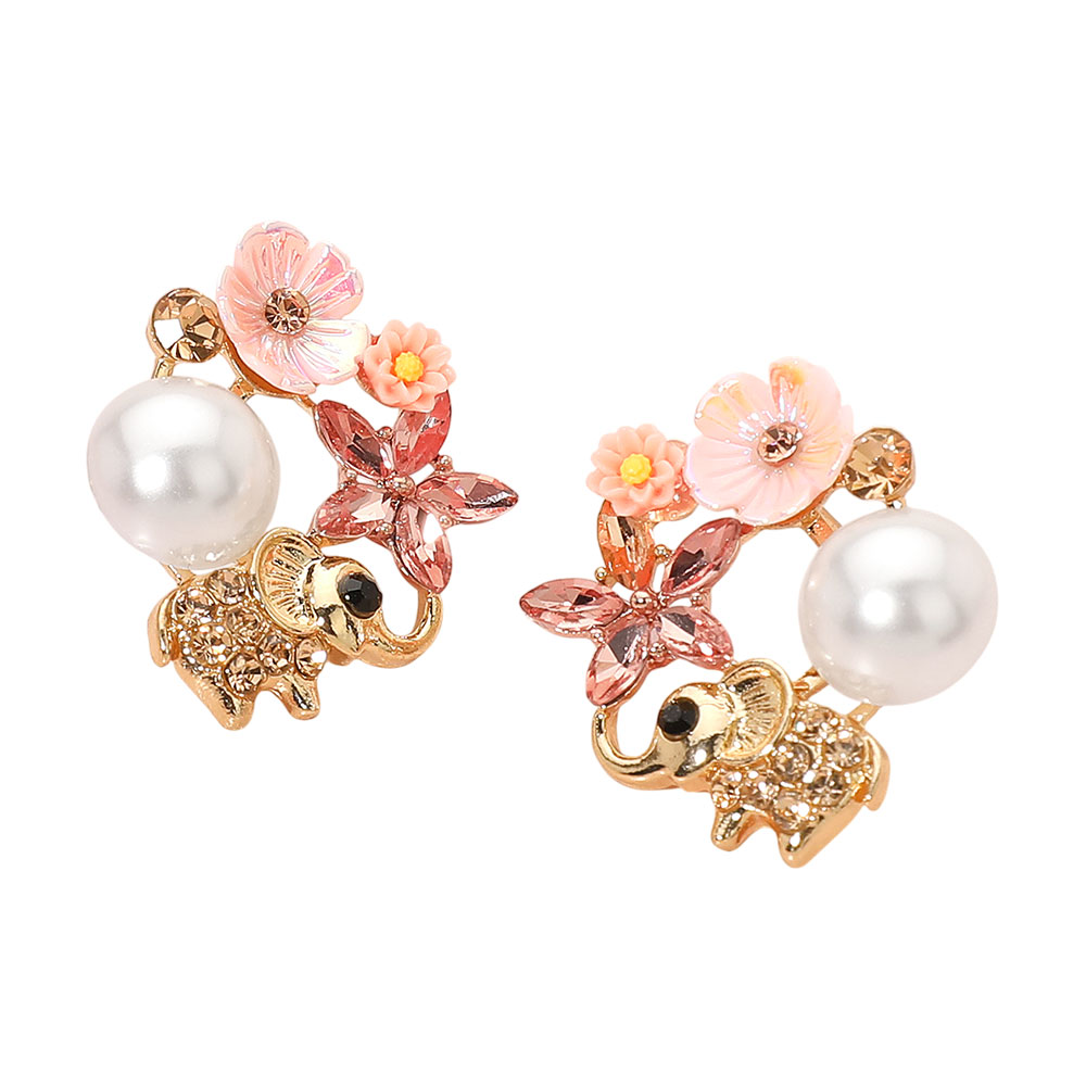 Details • Size : 1.25" X 1.25" • Post Back • Whimsical stud earrings featuring adorable elephant charms adorned with crystals, delicate floral details, and luminous pearl accents. A charming accessory that blends playful design with elegant sparkle, perfect for adding personality to casual or dressy looks. • Lead and Nickel Compliant