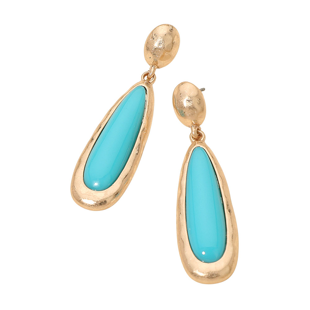 Details • Size : 0.6" X 2.2" • Post Back • These elongated teardrop statement earrings feature a sleek, polished centerpiece framed by a textured metallic design. Lightweight yet bold, they add modern sophistication to both casual and dressy looks, making them a versatile accessory for everyday wear or special events. • Lead and Nickel Compliant