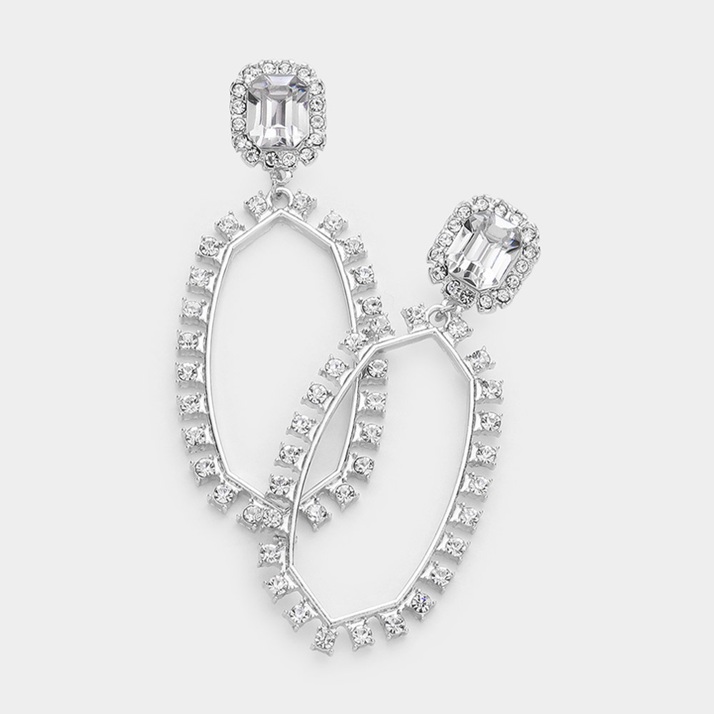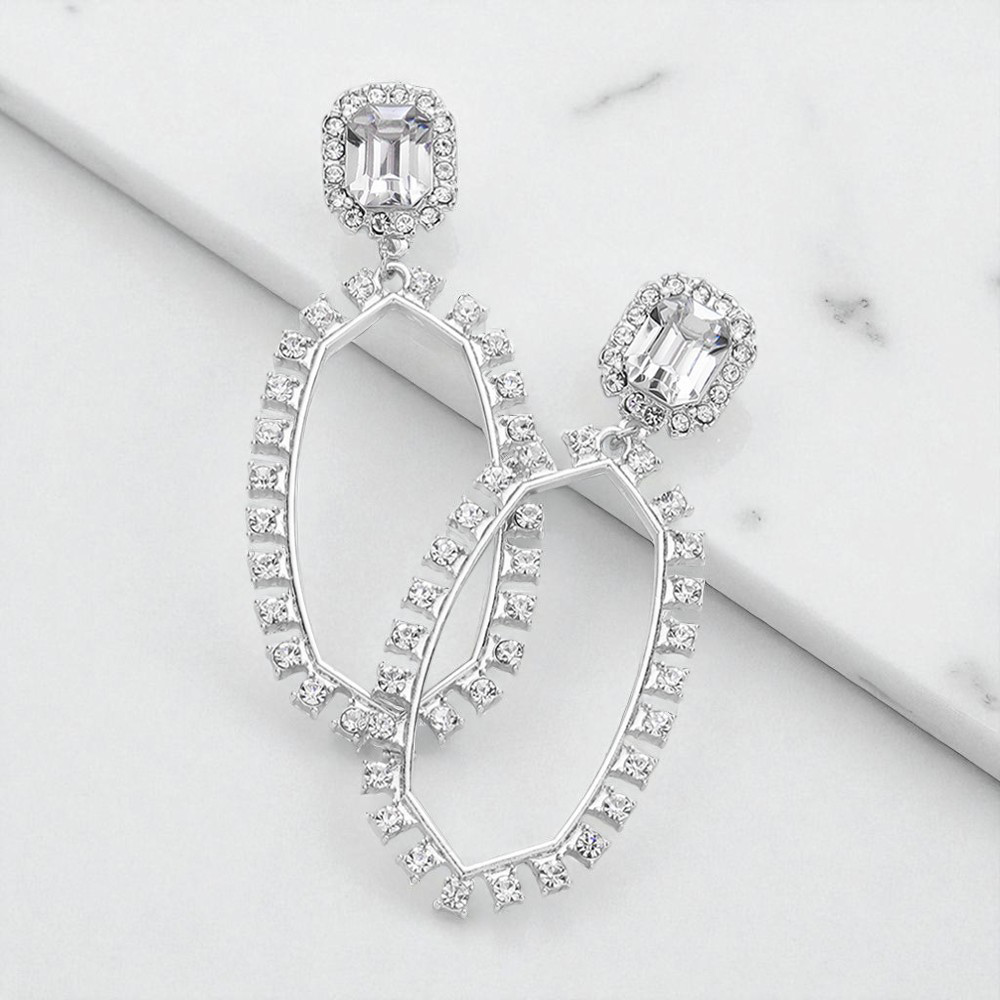 Emerald Cut Stone Accented Rhinestone Trimmed Open Hexagon Link Dangle Earrings