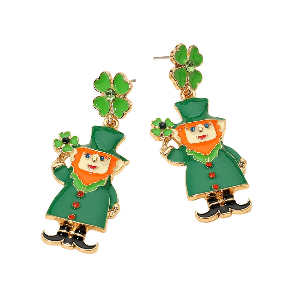 Details • Size : 0.8" X 2.2" • Post Back • Whimsical leprechaun drop earrings featuring a cheerful character holding a lucky shamrock with playful dangling movement. A festive accessory for St. Patrick’s Day outfits, themed parties, parades, and seasonal displays, designed to add charm, personality, and standout appeal to holiday looks. • Lead and Nickel Compliant