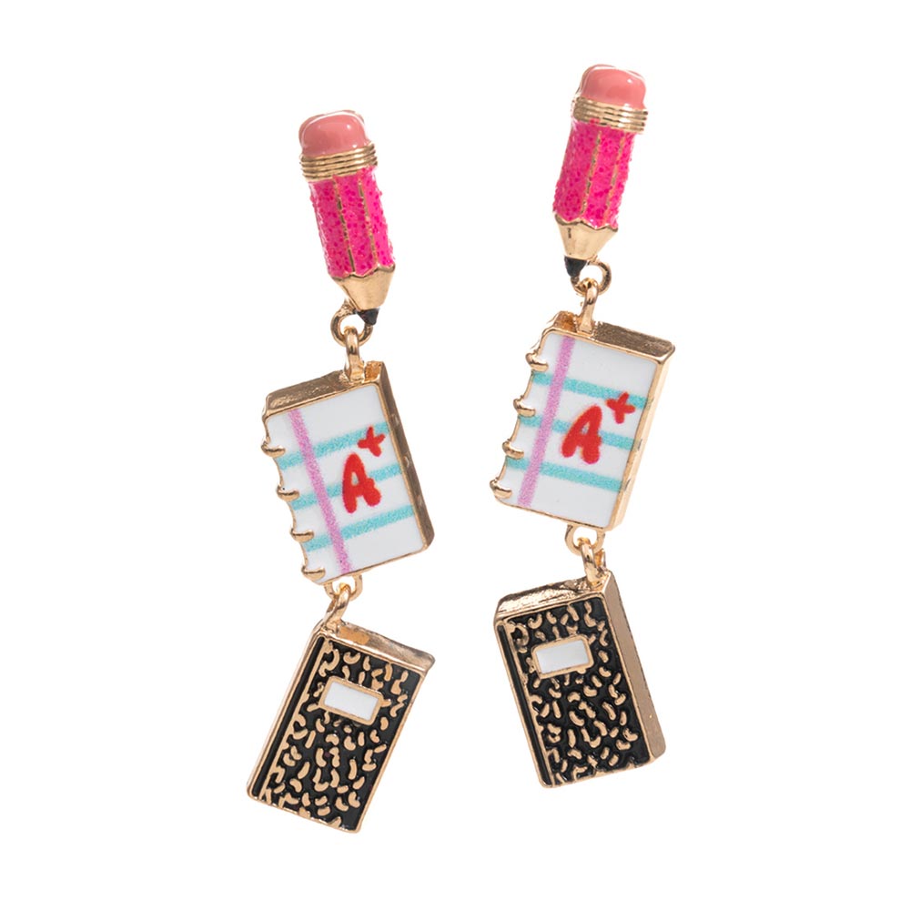 Details • Size : 0.6" X 2.5" • Titanium Post Back • These playful drop earrings feature a charming notebook and pencil design that adds a fun, school-inspired touch to any outfit. Lightweight with eye-catching movement, they are perfect for themed collections, gifting, or adding personality to everyday looks. A whimsical accessory ideal for teachers, students, or anyone who loves novelty-style jewelry. • Lead and Nickel Compliant • Hypoallergenic