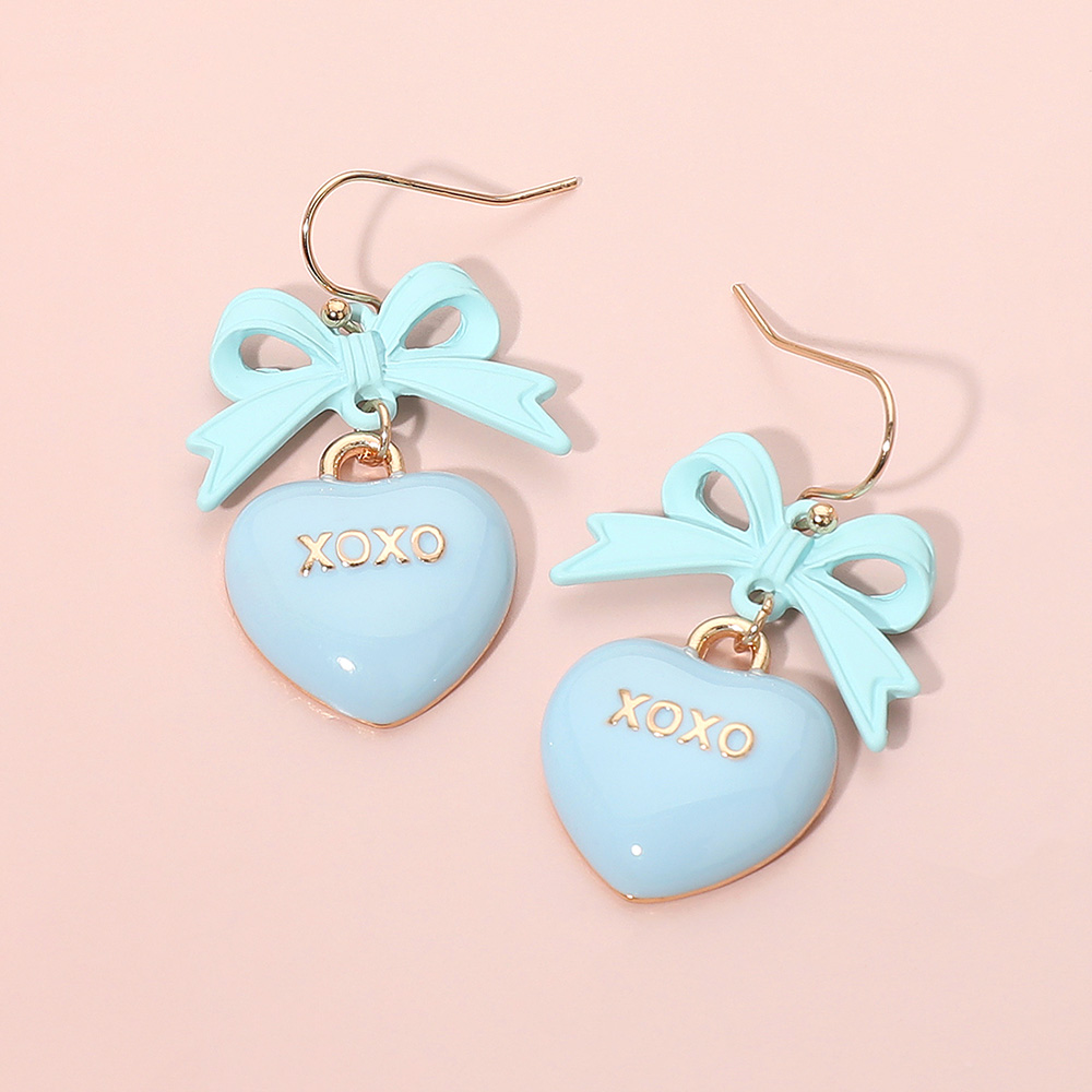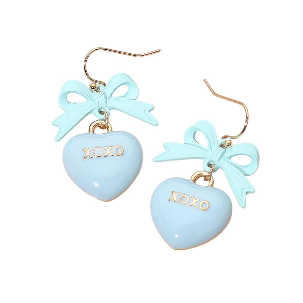 Details • Size : 1" X 1.75" • Fish Hook Back • Adorable heart drop earrings featuring a sweet bow accent and “XOXO” charm. Lightweight dangling design adds a playful, romantic touch to any outfit. Perfect for gifting, everyday styling, or completing a charming accessory collection. • Lead and Nickel Compliant