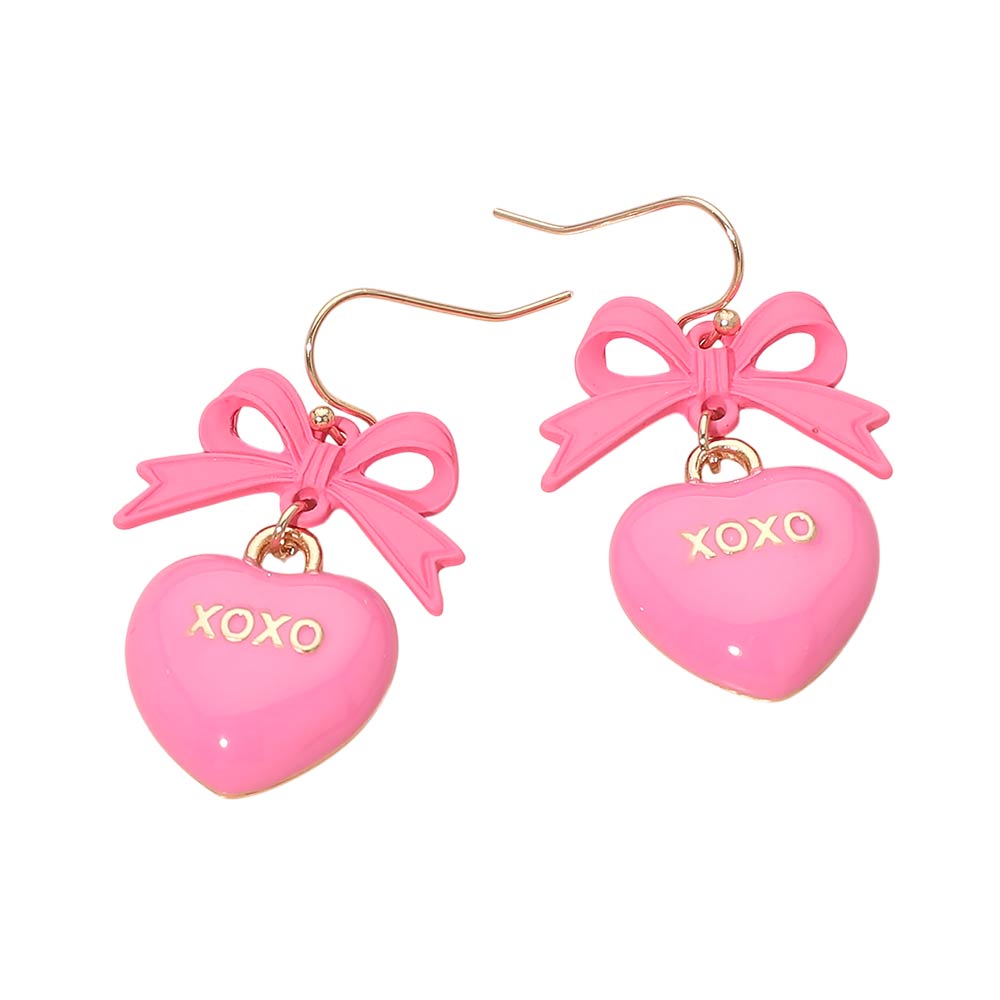 Details • Size : 1" X 1.75" • Fish Hook Back • Adorable heart drop earrings featuring a sweet bow accent and “XOXO” charm. Lightweight dangling design adds a playful, romantic touch to any outfit. Perfect for gifting, everyday styling, or completing a charming accessory collection. • Lead and Nickel Compliant