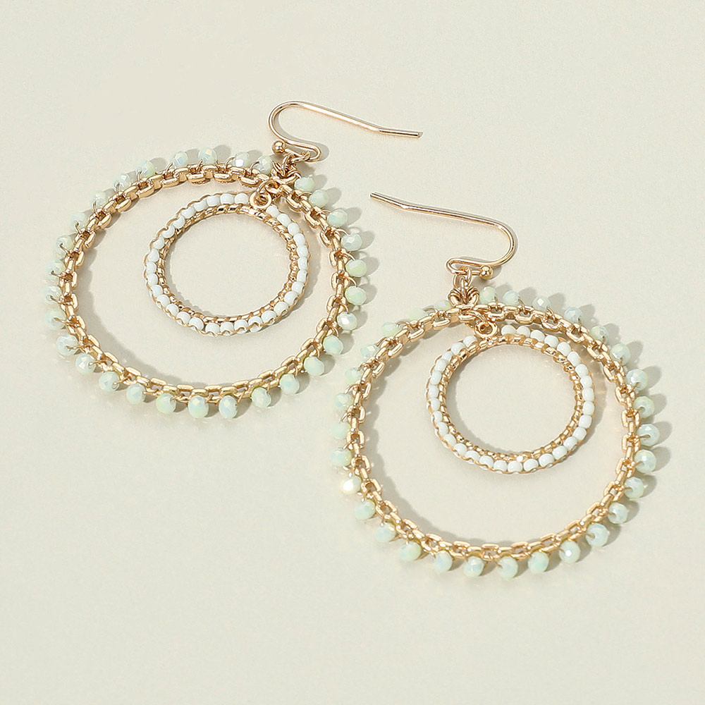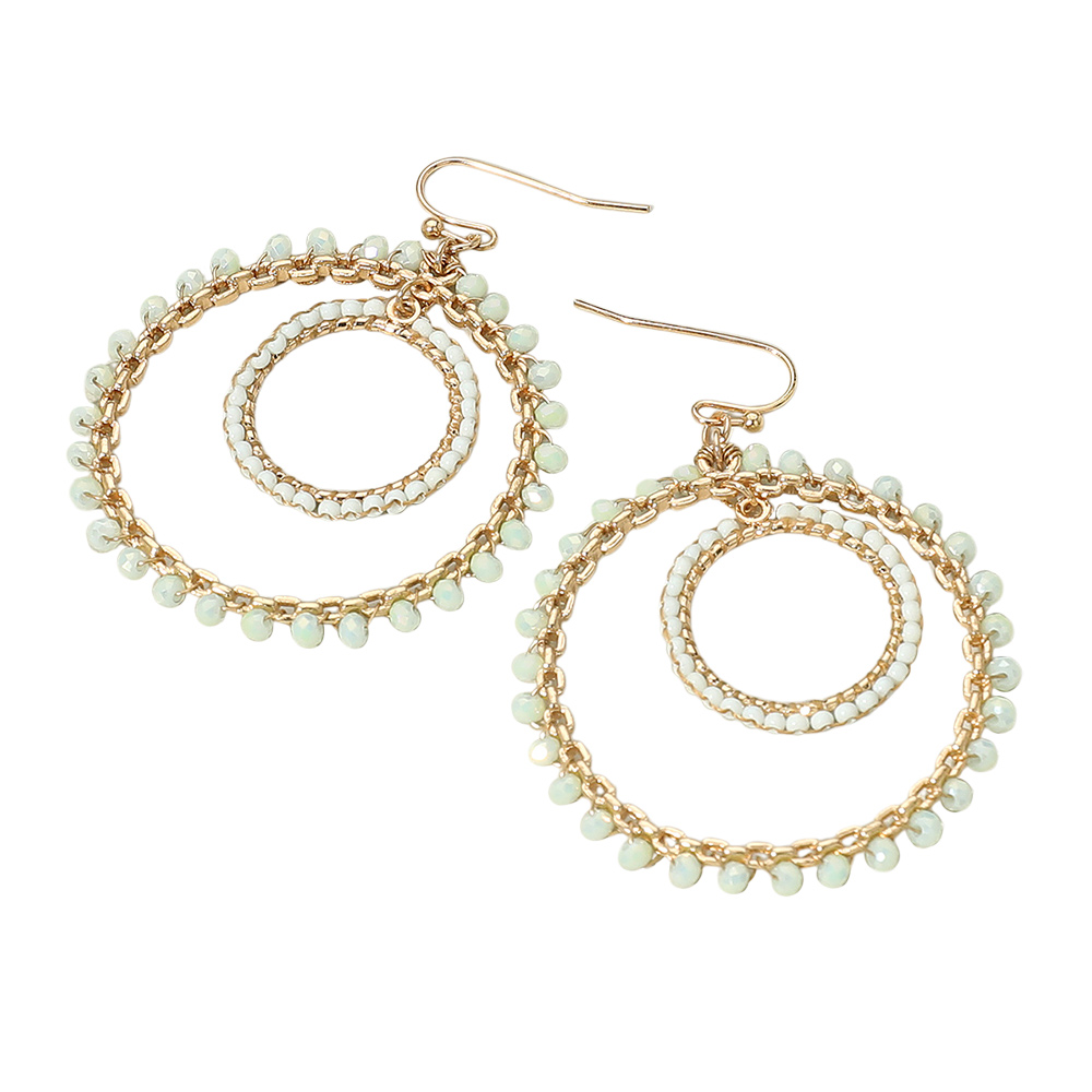 Details • Size : 1.75" X 2.25" • Fish Hook Back • Make a bold impression with these layered hoop earrings featuring double circle design and delicate beaded accents. Lightweight yet striking, they blend elegance with modern style, perfect for enhancing casual outfits or adding a statement touch to evening and special occasion looks. • Lead and Nickel Compliant