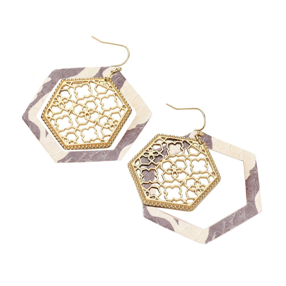 Details • Size : 1.75" X 2.25" • Fish Hook Back • Elevate your style with these hexagon drop earrings featuring a bold layered frame and delicate lace-inspired inner detail. Lightweight and versatile, they add modern elegance to both casual outfits and evening looks. • Lead and Nickel Compliant