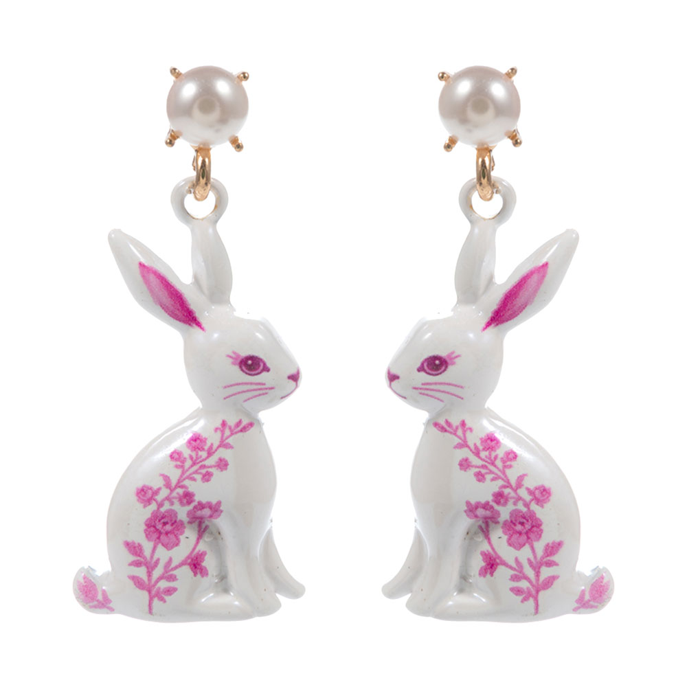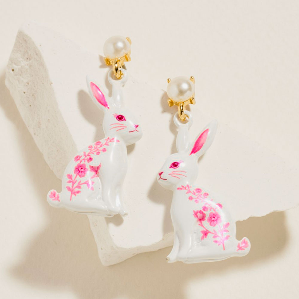 Details • Size : 0.75" X 1.5" • Titanium Post Back • Delicate drop earrings featuring a charming bunny silhouette with floral detailing and a classic stud top. Designed to add playful elegance to spring outfits, Easter celebrations, and seasonal gifting. A unique statement accessory ideal for boutiques seeking whimsical, collectible-inspired jewelry. • Hypoallergenic • Lead and Nickel Compliant