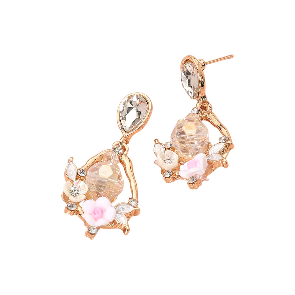 • Romantic drop earrings featuring faceted crystals framed in a floral-inspired setting with delicate rose and leaf accents. The intricate design and shimmering finish create a soft, elegant look—perfect for weddings, parties, or any refined occasion.
