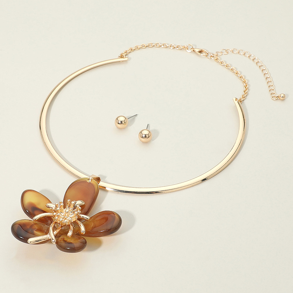 • This floral statement collar necklace and stud earring set features a sleek curved silhouette accented with a bold flower centerpiece for modern elegance. Designed to elevate boutique assortments, it is ideal for statement styling, gifting, and fashion-forward looks that transition easily from day to night.