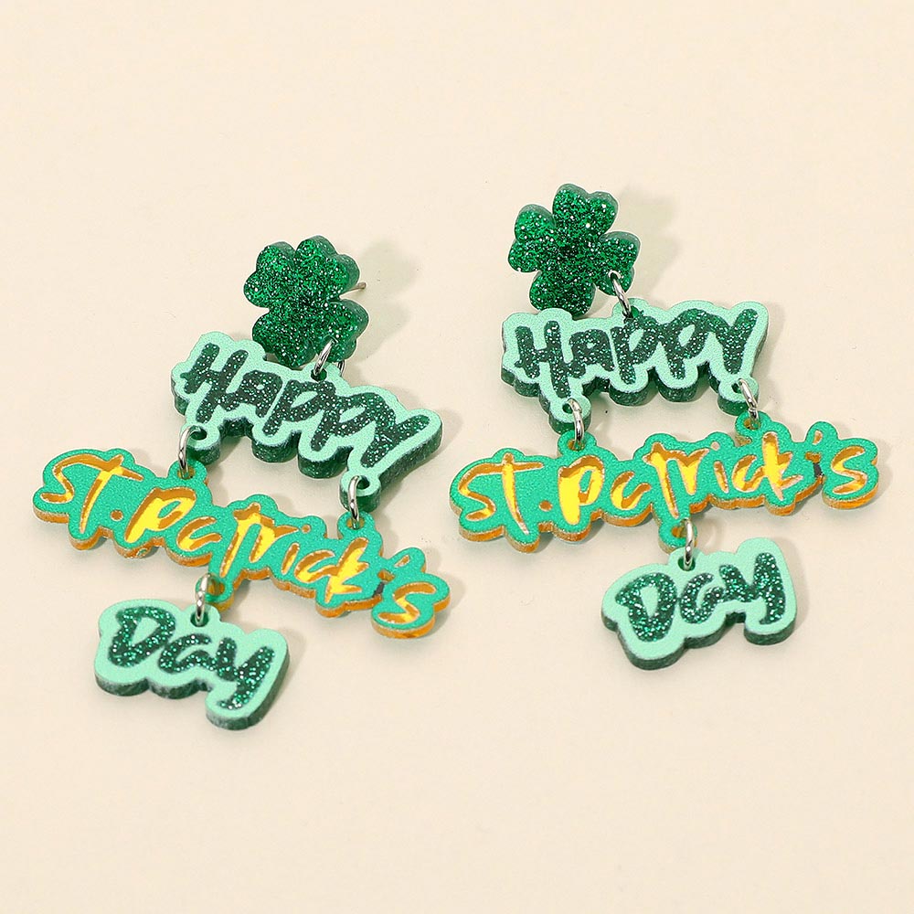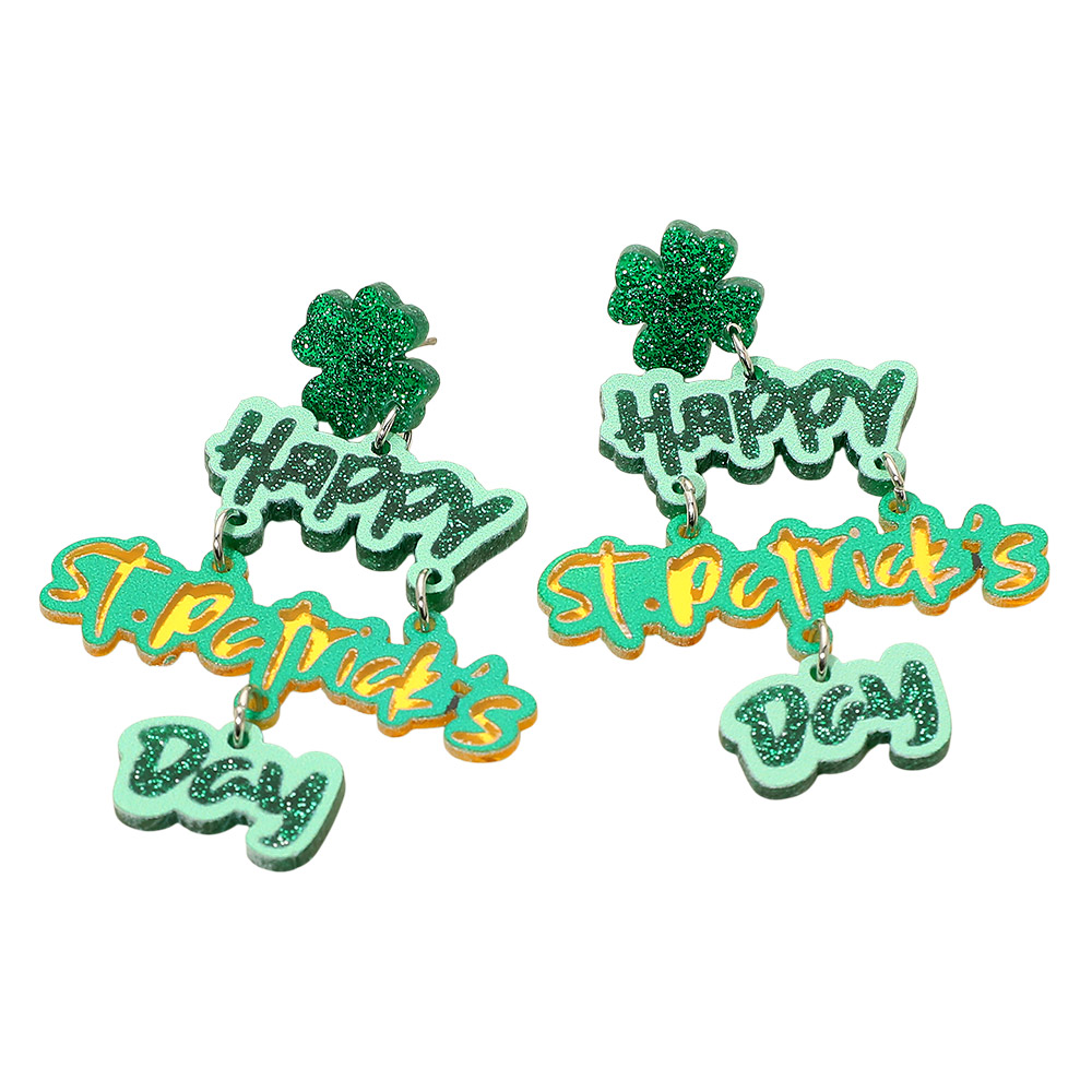 Details • Size : 1.8" X 2.6" • Post Back • Festive St. Patrick’s Day drop earrings featuring playful word charms and shamrock accents with fun layered movement. A bold statement accessory for holiday outfits, parades, parties, and themed events, designed to add cheerful personality and eye-catching flair to seasonal looks. • Lead and Nickel Compliant