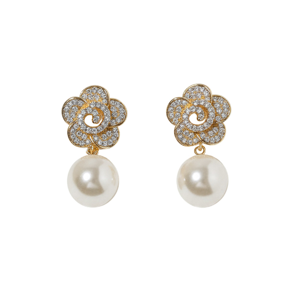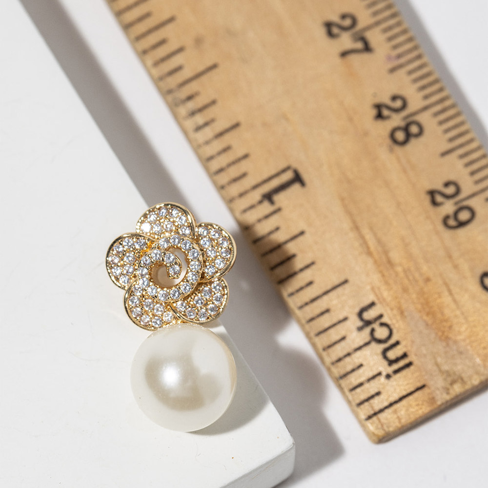Details • Size : 0.5" X 0.9" • Charming floral stud earrings finished with a graceful drop bead detail for a classic yet feminine look. Designed to elevate everyday outfits, special occasions, and gift assortments, this elegant style offers timeless appeal with a delicate statement that pairs effortlessly with modern and dressy jewelry collections. • CZ Cubic Zirconia • Gold Dipped • Lead and Nickel Compliant • Made In Korea • Sterling Silver Post