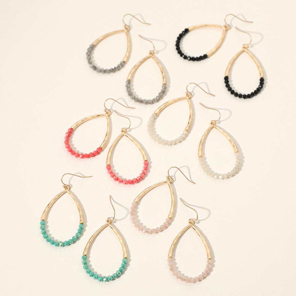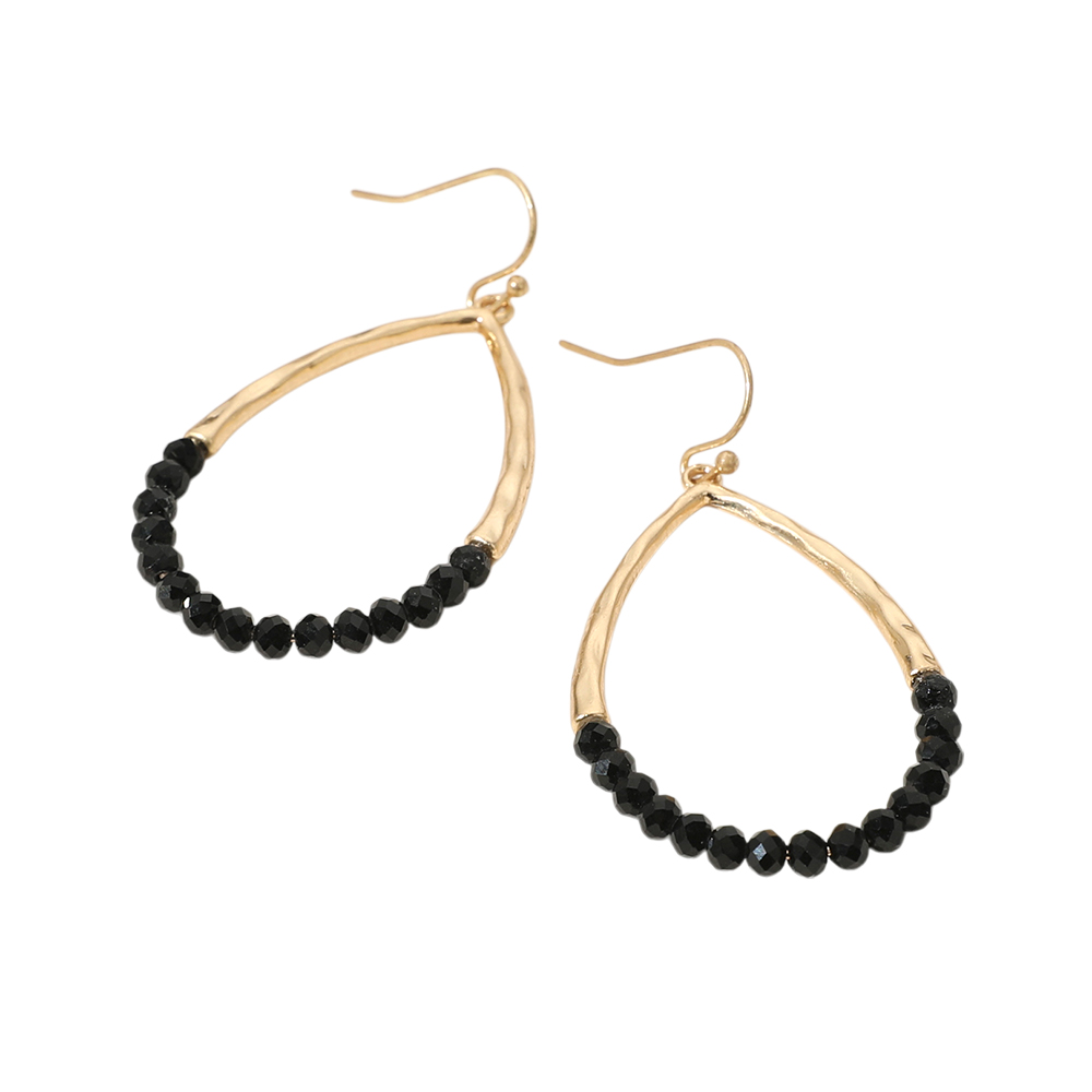 Details • Size : 1.1" X 2" • Fish Hook Back • Modern teardrop earrings featuring a sleek, curved frame accented with a row of faceted beads. These earrings offer a bold yet elegant touch, perfect for enhancing both everyday outfits and formal ensembles. A versatile accessory for timeless, polished style. • Lead and Nickel Compliant