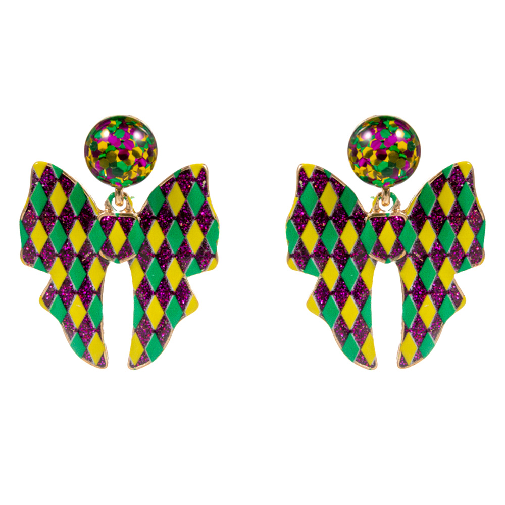 Details • Size : 1.2" X 1.5" • Titanium Post Back • Make a bold statement with these festive harlequin bow earrings, featuring a dazzling geometric pattern and glitter finish. Perfect for parties, carnivals, and celebrations, they bring playful charm and artistic flair to any outfit, capturing vibrant, joyful energy. • Hypoallergenic • Lead and Nickel Compliant