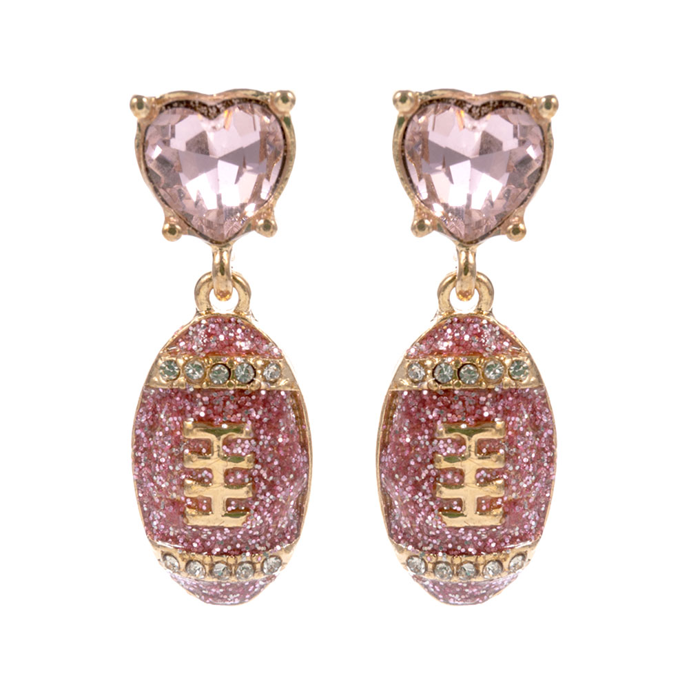Details • Size : 0.4" X 1.2" • Titanium Post Back • Add sporty sparkle to your look with these heart and glitter football drop earrings. Designed with radiant stones and a shimmering finish, they blend athletic charm with chic elegance—perfect for game days, parties, or making a bold statement anytime. • Hypoallergenic • Lead and Nickel Compliant