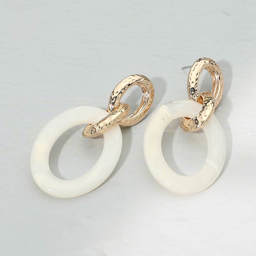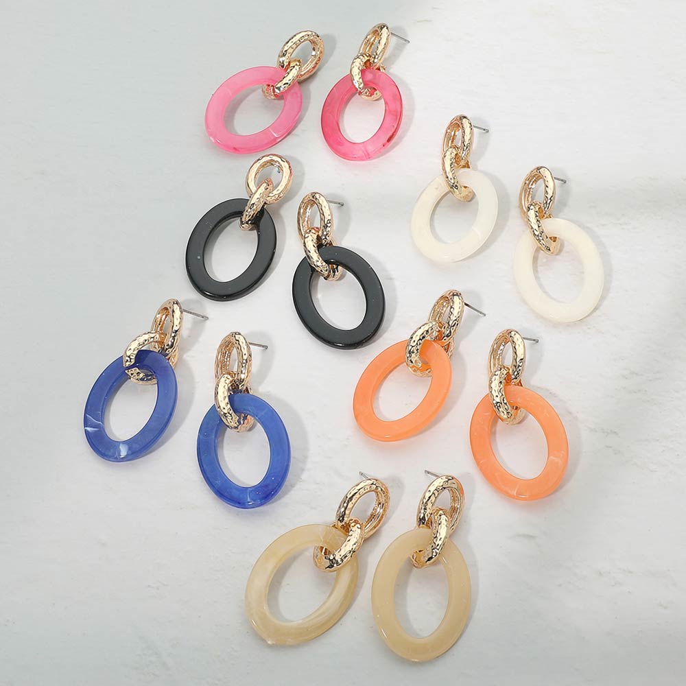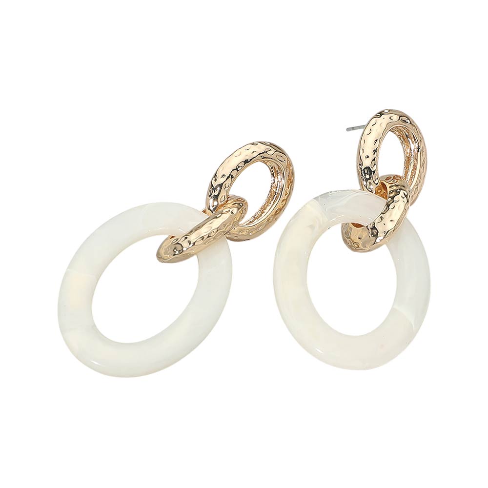 Details • Size : 1.2" X 2.25" • Post Back • Modern linked drop earrings featuring a smooth oval design paired with a textured ring accent for added depth and movement. The layered silhouette creates an elegant balance of structure and flow, making these earrings easy to style from day to night. A versatile statement accessory that elevates everyday outfits, workwear, and special occasion looks with effortless sophistication. • Lead and Nickel Compliant
