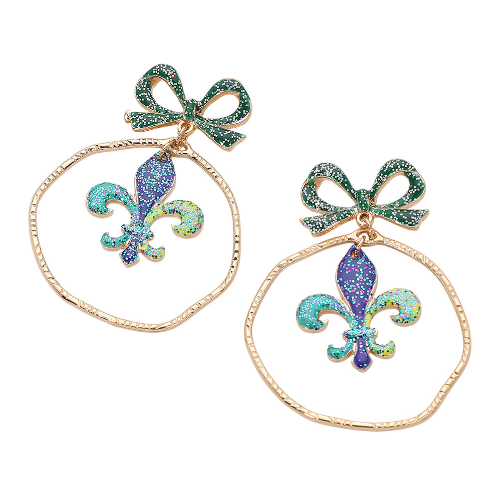 Details • Size : 1.6" X 2" • Post Back • Decorative hoop drop earrings featuring a bow accent and fleur-de-lis charm for eye-catching movement and festive appeal. Designed to elevate party outfits, themed events, parades, and seasonal displays, these statement earrings add playful elegance and standout style to any jewelry collection. • Lead and Nickel Compliant