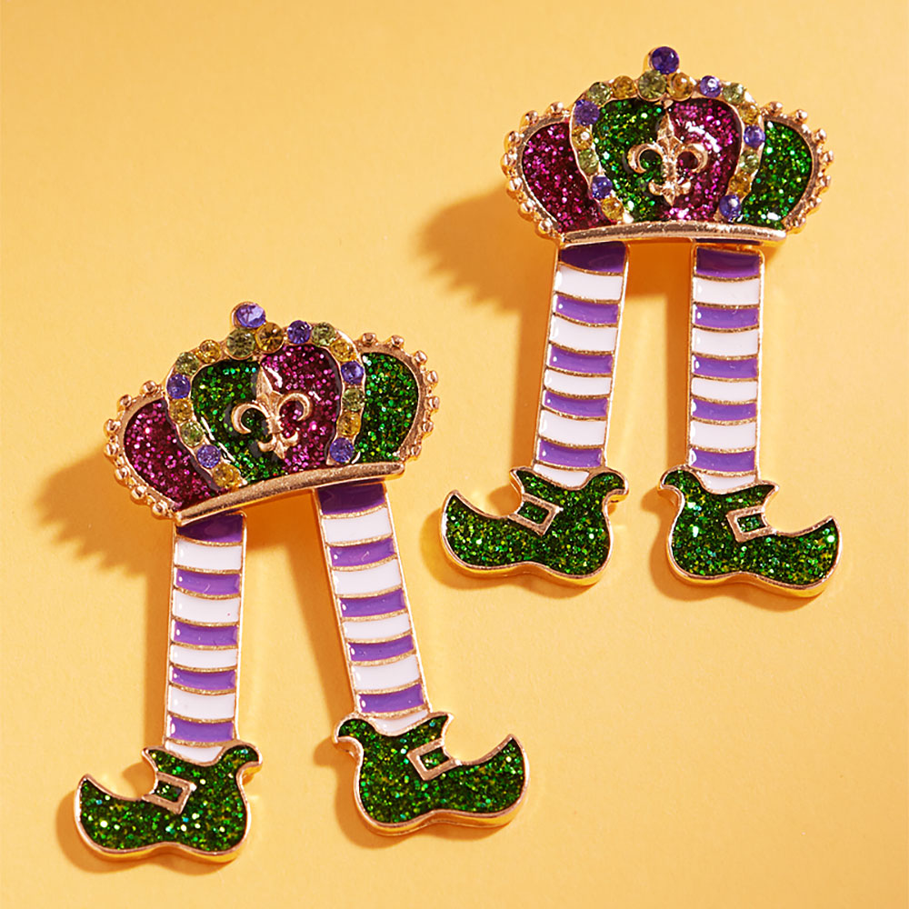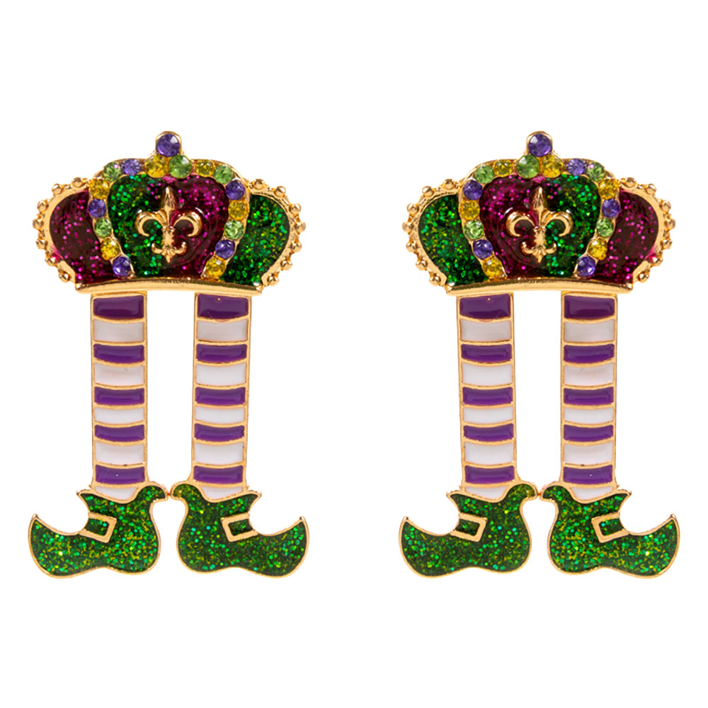• Add festive flair to your celebration look with these Mardi Gras Crown and Shoe Drop Earrings. Designed with playful striped legs and sparkling accents, they capture the lively essence of the season, perfect for parades, parties, and standout costume ensembles.