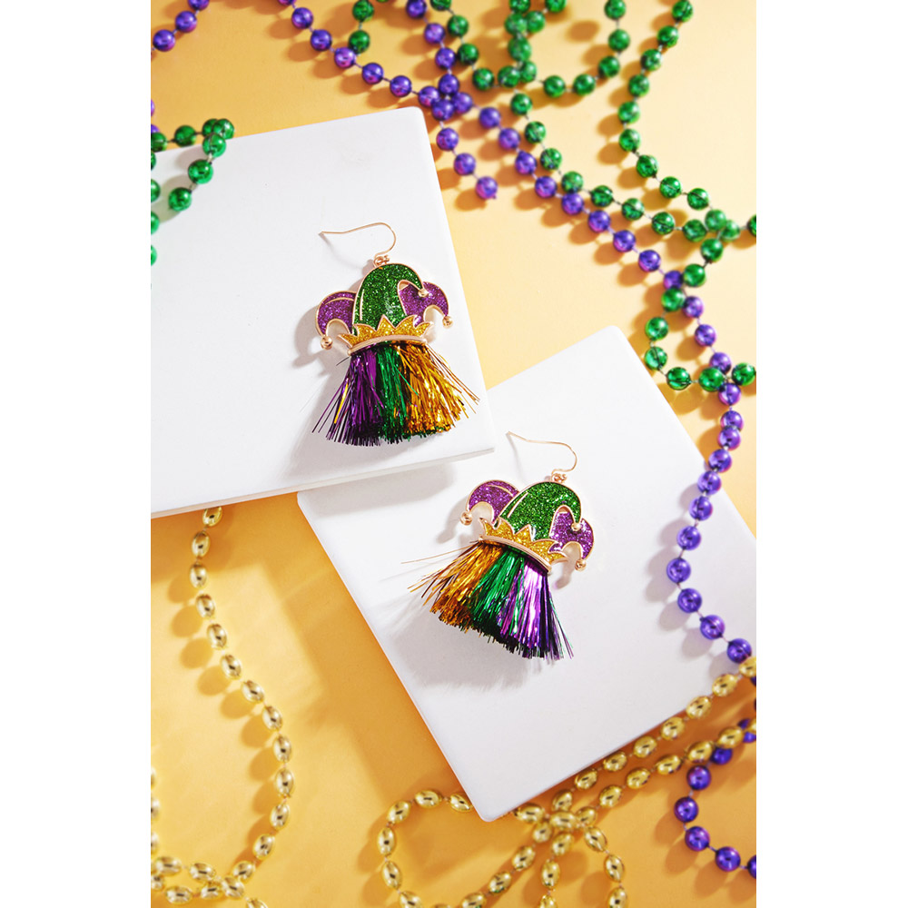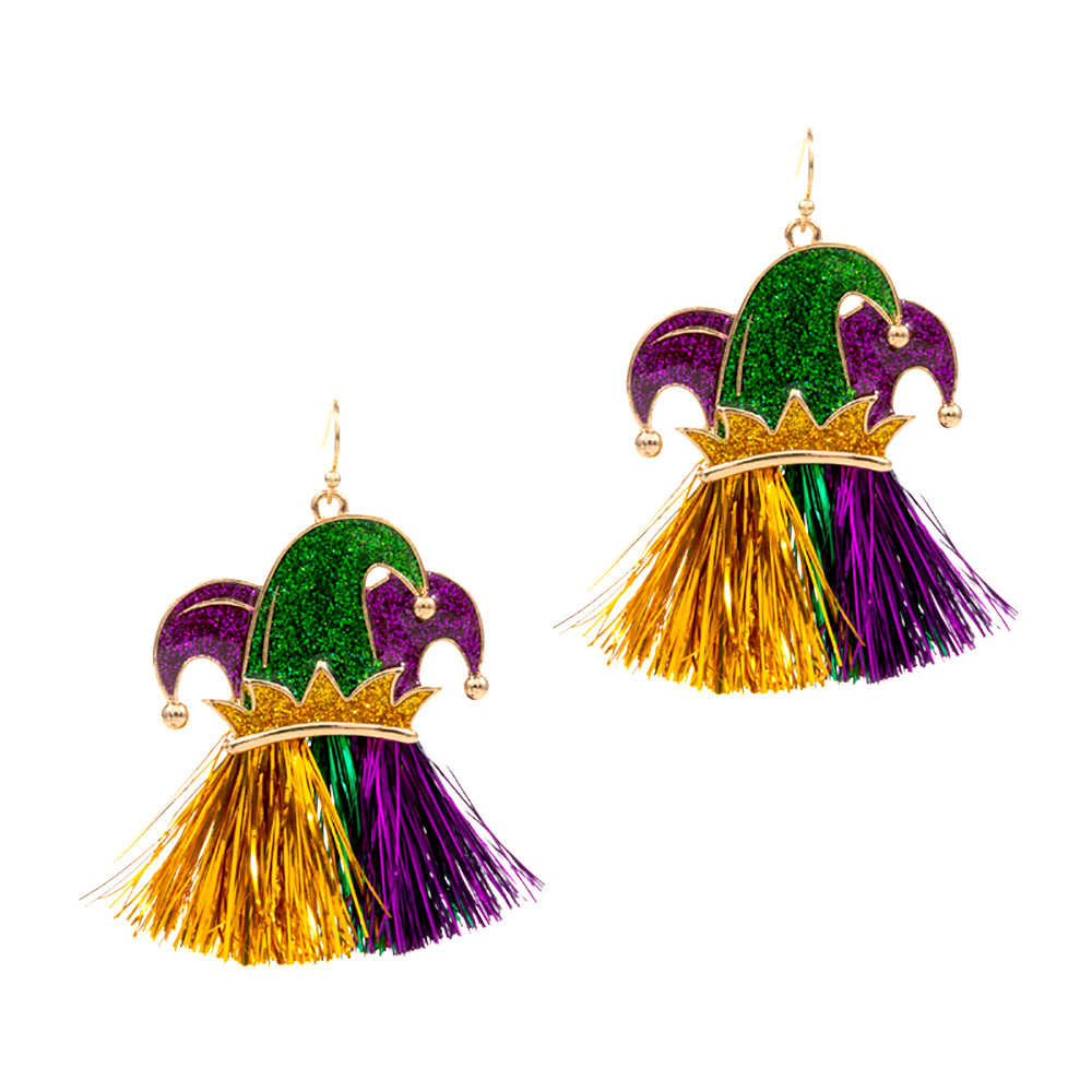 Mardi Gras Glittered Jester Pierrot Tassel Fringe Dangle Earrings