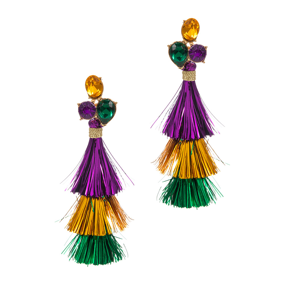 Details • Size : 0.5" X 2.6" • Post Back • Bold tiered tassel drop earrings featuring layered fringe movement and faceted stone accents for dramatic statement style. Designed to sway beautifully with motion, these earrings elevate party looks, celebrations, parades, and themed outfits while remaining lightweight and comfortable to wear. • Lead and Nickel Compliant
