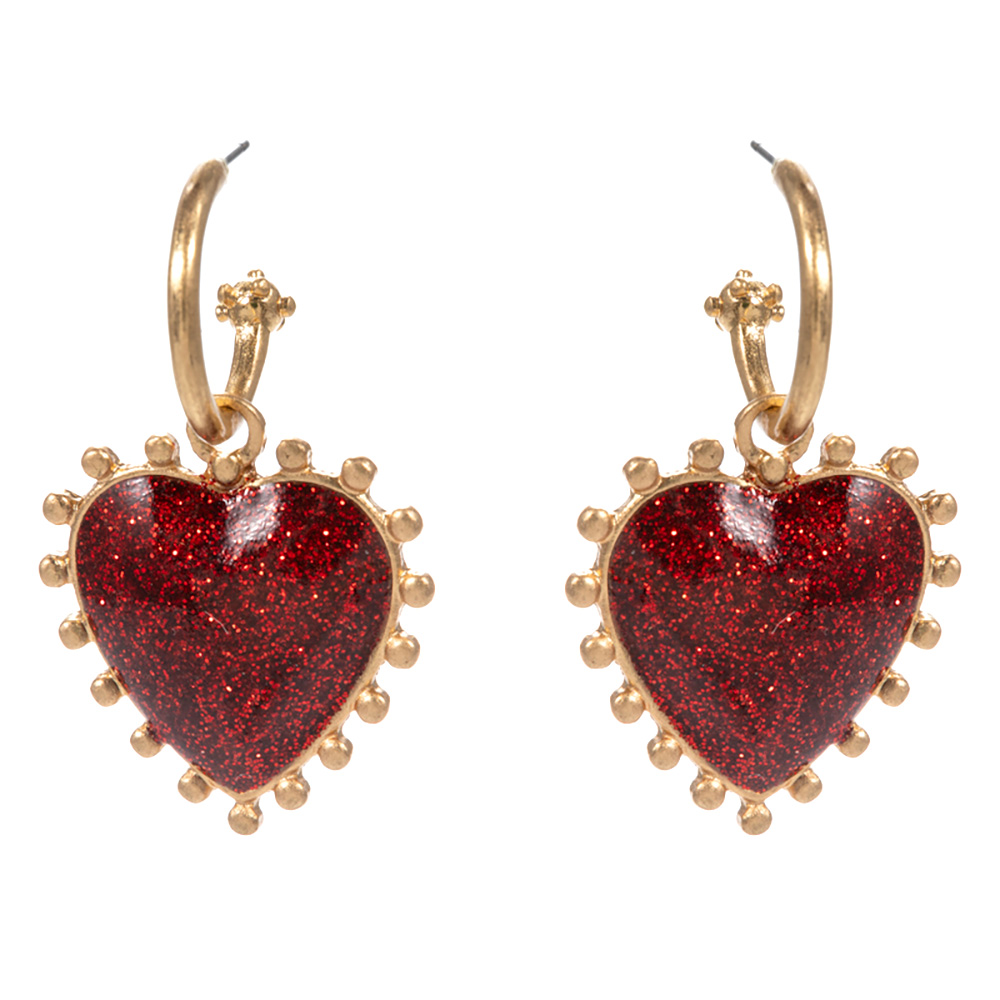 Details • Size : 1" X 1.6" • Titanium Post Back • Chic heart hoop earrings featuring a glitter accent and beaded edge for a playful yet elegant look. Perfect for adding sparkle to everyday outfits or special occasions, these earrings bring charm and shine, making them a stylish choice for festive or romantic wear. • Hypoallergenic • Lead and Nickel Compliant