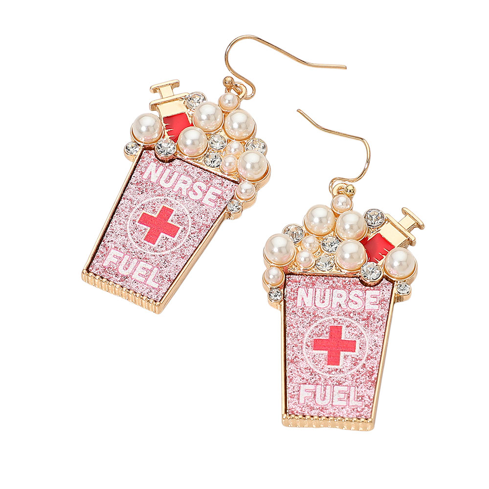 Details • Size : 1" X 2" • Fish Hook Back • Playful statement earrings featuring a to-go cup design inspired by healthcare hustle, accented with sparkling details for a fun pop of personality. Perfect for gifting to nurses, coworkers, or fans of novelty accessories. • Lead and Nickel Compliant