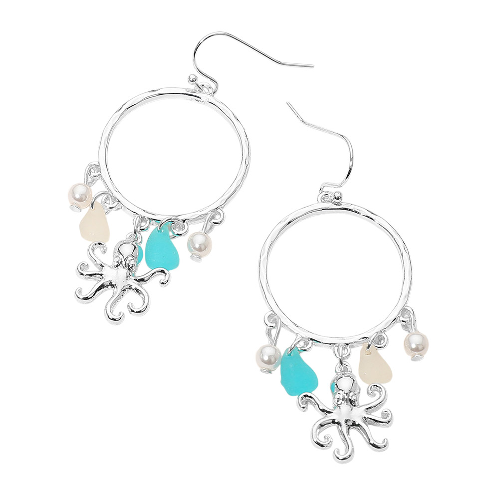 Octopus Sea Glass Charm Drop Open Ring Dangle Earrings