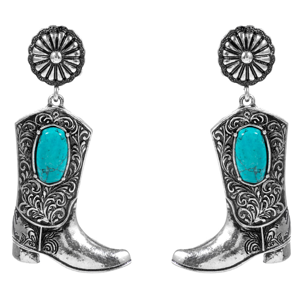 Details • Size : 1.25" X 2.25" • Titanium Post Back • Eye-catching dangle earrings shaped in a classic western boot motif with ornate detailing, made to add bold personality to casual outfits, concerts, festivals, themed events, or everyday styling for fans of statement accessories and standout fashion pieces. • Lead and Nickel Compliant