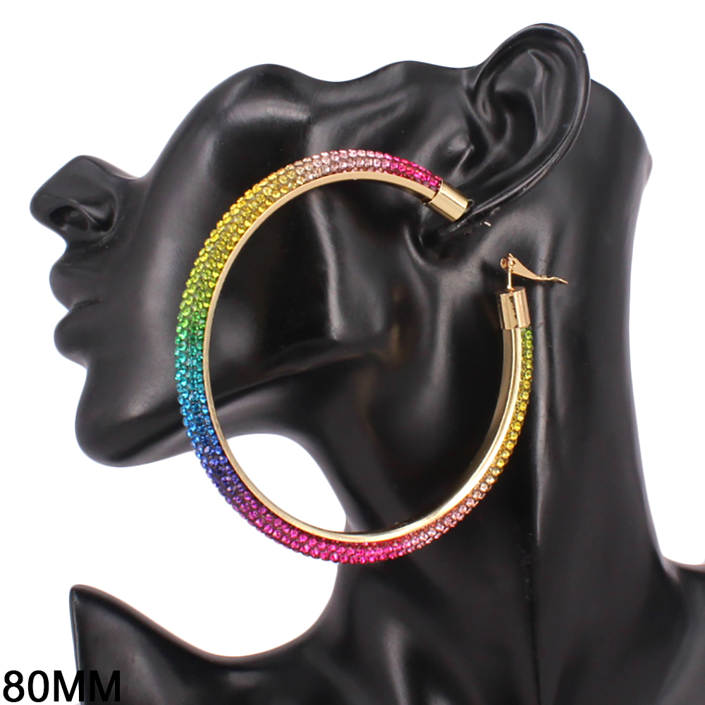 • Statement hoop earrings designed with a sleek curved silhouette and fully embellished surface for maximum shine. The bold 80mm size creates instant impact while remaining lightweight and comfortable for extended wear. Ideal for parties, festivals, night events, and trend-forward jewelry collections.