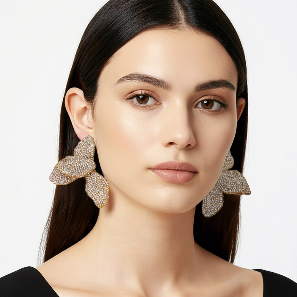 Oversized Rhinestone Paved Floral Petal Statement Earrings