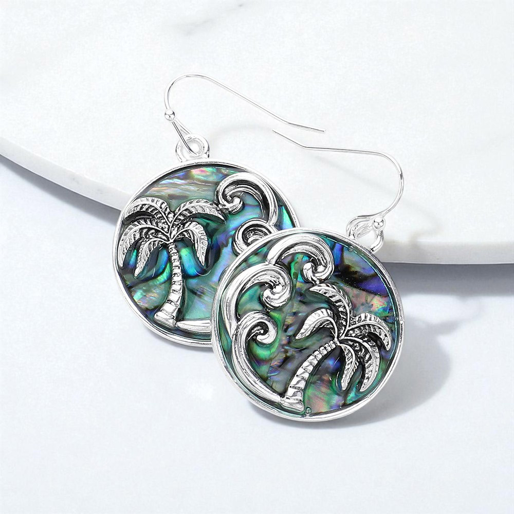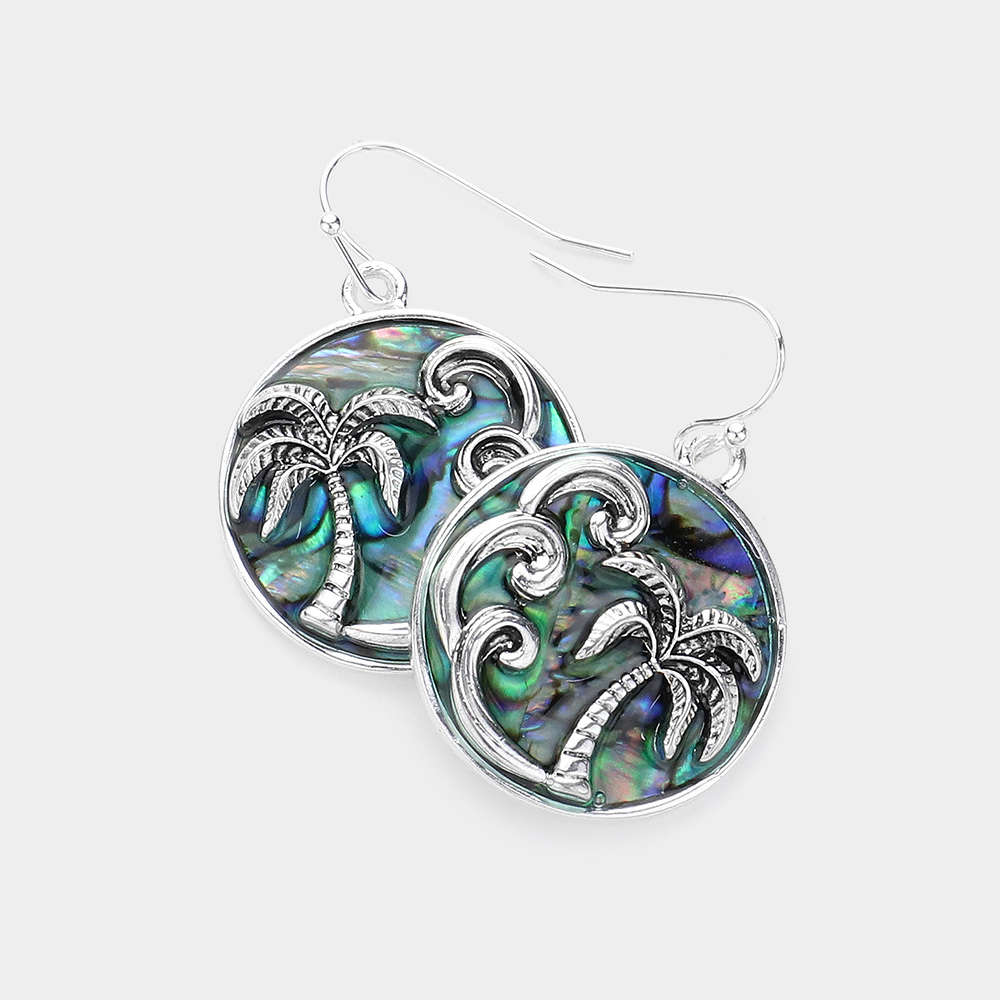 Antique Metal Abalone Palm Tree Circle Dangle Earrings